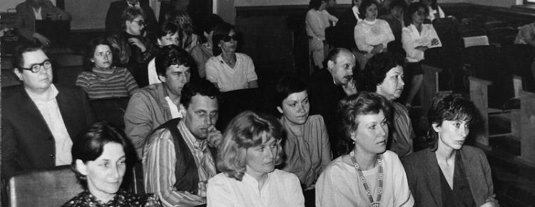16. Черговий захід в лекторії Заповідника. На фото: П. Дарманський, О. Загребельний, М. Васильєв, О. Павлик, Н. Бондаренко, Н. Хомутова, Г. Котова, А. Бабіч, В. Андрущенко, В. Нейман, Т. Кусок, Н. Горська, В. Колпакова, Н. Романова. Кінець 1980-х рр.