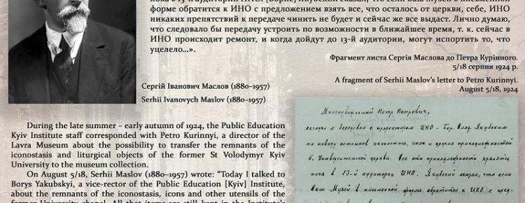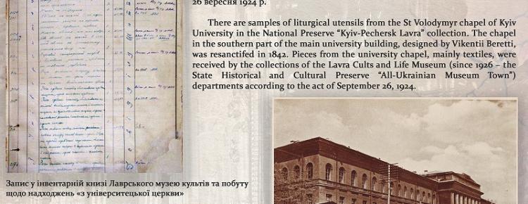 Раді представити вашій увазі черговий випуск «Експоната місяця», який приурочений до Дня пам’яті рівноапостольного князя Київського Володимира Святославовича та Хрещення Русі. Експонатами липня є богослужбові тканини університетської церкви в ім’я св. Володимира. Понад сто предметів надійшли до колекції Лаврського музею культів та побуту восени 1924 р. Частину пам’яток списали й вилучили на початку 1925 р. та 1931 р. Деякі тканини з університетської церкви вціліли і нині перебувають у колекції Національного заповідника “Києво-Печерська лавра”, зокрема й ті, що на початку 1930-х рр. експонували у Київському антирелігійному музею – філіалі Всеукраїнського музейного городка у Володимирському соборі в Києві.