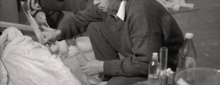 Іл. 9. Процес реставрації скульптури «Віра» пам’ятника князю Костянтину Іпсіланті. Скульптор Василь Мікропуло моделює конфігурацію руки скульптури та хреста. 1996 р. (інв. № КПЛ-Н-8114)