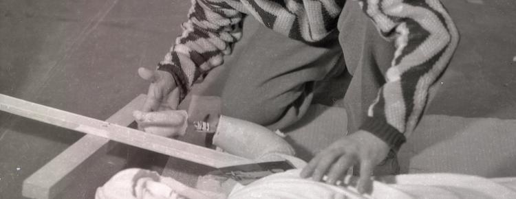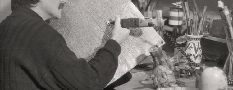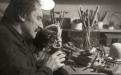 Іл. 16. Процес реставрації меморіальної дошки з постаменту пам’ятника князю Костянтину Іпсіланті. У реставраційній майстерні художник-реставратор Віктор Баглей очищає поверхню меморіальної дошки. На столі перед ним серед інструментів лежить чаша від скульптури «Віра» та бронзові левові лапи від саркофага пам’ятника. 1996 р. (інв. № КПЛ-Н-8111)