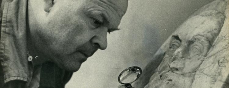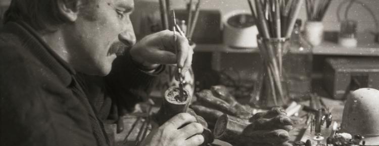 Іл. 18. Скульптор С. Швець моделює акротерій-маску від саркофага пам’ятника князю Костянтину Іпсіланті. 1996 р. (інв. № КПЛ-Н-8113)