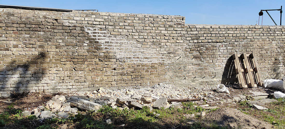 У вересні та жовтні 2021 р. її досліджували у три етапи та на двох рівнях (іл. 2). Перший становив вивчення підмурків поблизу північно-західного контрфорсу на нижньому рівні (іл. 3-4). Метою робіт була фіксація рівня залягання фундаментів та оцінки їхнього стану. В нижній частині фундаментної групи зафіксовано посилення муру з цегли ХХ ст. Це свідчить про нещодавній ремонт споруди, тому культурних шарів та знахідок не виявлено.
