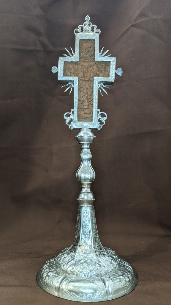 Хрест з оправою заввишки 35,5 см, довжина горизонтальної балки – 10,0 см. Зображення виконано площинним різьбленням високого та середнього рельєфу. У середохрестях лицевого та зворотного боків – традиційні композиції: Розп’яття (лицевий) та Хрещення (зворотній). Перша житійна композиція лицевого боку ілюструє конфлікт св. Варвари з її батьком Діоскором. Звертаючись до батька, Варвара однією рукою вказує на небо (і водночас на центральну композицію – Розп’яття), другою – на «мармур», на якому вона, згідно з її житієм, начертала зображення хреста. Постать Діоскора демонструє його неприйняття обраної донькою віри в Христа.