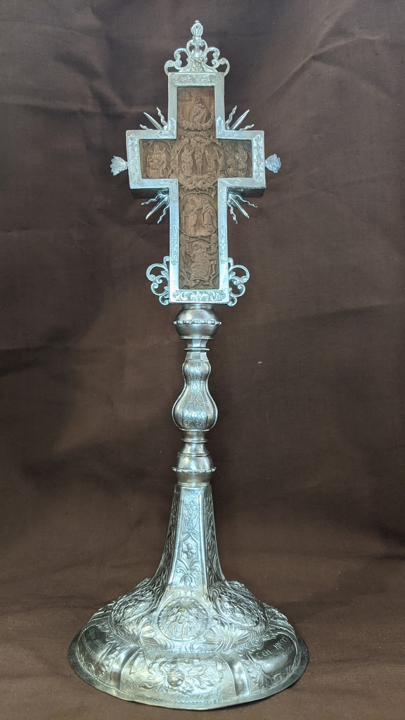 Іконографія українських різьблених хрестів доби бароко багата на сюжети. Прикладом тому є напрестольний хрест 1759 р., зроблений, згідно з написом на його срібній оправі, коштом «знатних товарищей козака Кирика Куреня Менського покійного» (КПЛ-М-9368). Це одна з рідкісних пам’яток колекції різьбленої сакральної пластики Заповідника з ім’ям різьбяра – «Леонтій». Іконографію хреста можна назвати унікальною – сім з дванадцяти його клейм житійні, що на хрестах практично не трапляється. Композиції ілюструють житіє особливо шанованої в Україні святої, покровительки військових і тих, хто помер раптово, без каяття та причастя – великомучениці Варвари.