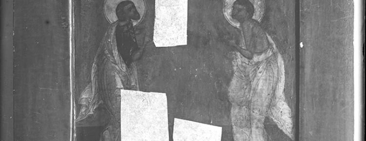 Іл. 1. «Охоронна» (реставраційна) заклейка на іконі «Святі Прокопій та Іоанн Устюзькі чудотворці» з колекції Церковно-археологічного музею при КДА (№ 4500), пізніше – відділу станкового малярства Лаврського музею культів та побуту/Всеукраїнського музейного городка. Фотографічний знімок 1920 х рр. (З колекції Національного заповідника «Києво-Печерська лавра»: КПЛ-Н-2139).