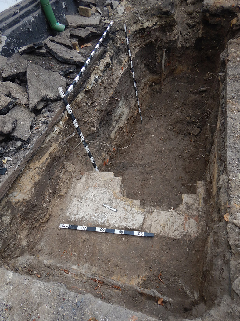 Для визначення стану пам’ятки архітектури – будівлі колишньої митрополичої бібліотеки (корп. № 5) з метою подальшої реставрації запрошене ТОВ «Медінжсервіс» розпочало її дослідження у 2018 р. Тоді було проведено обстеження інженерно-геологічних умов майданчика забудови споруди і визначено фізико-механічні властивості ґрунтів під цегляними фундаментами, які виявилися продовженнями стін. У двох із семи закладених на глибину до 0,9 м шурфах було виявлено заповнення двох об’єктів (шурфи 1, 7). На жаль, отримана фрагментарна інформація не була достатньою для визначення і датування цих об’єктів (іл. 1).