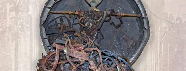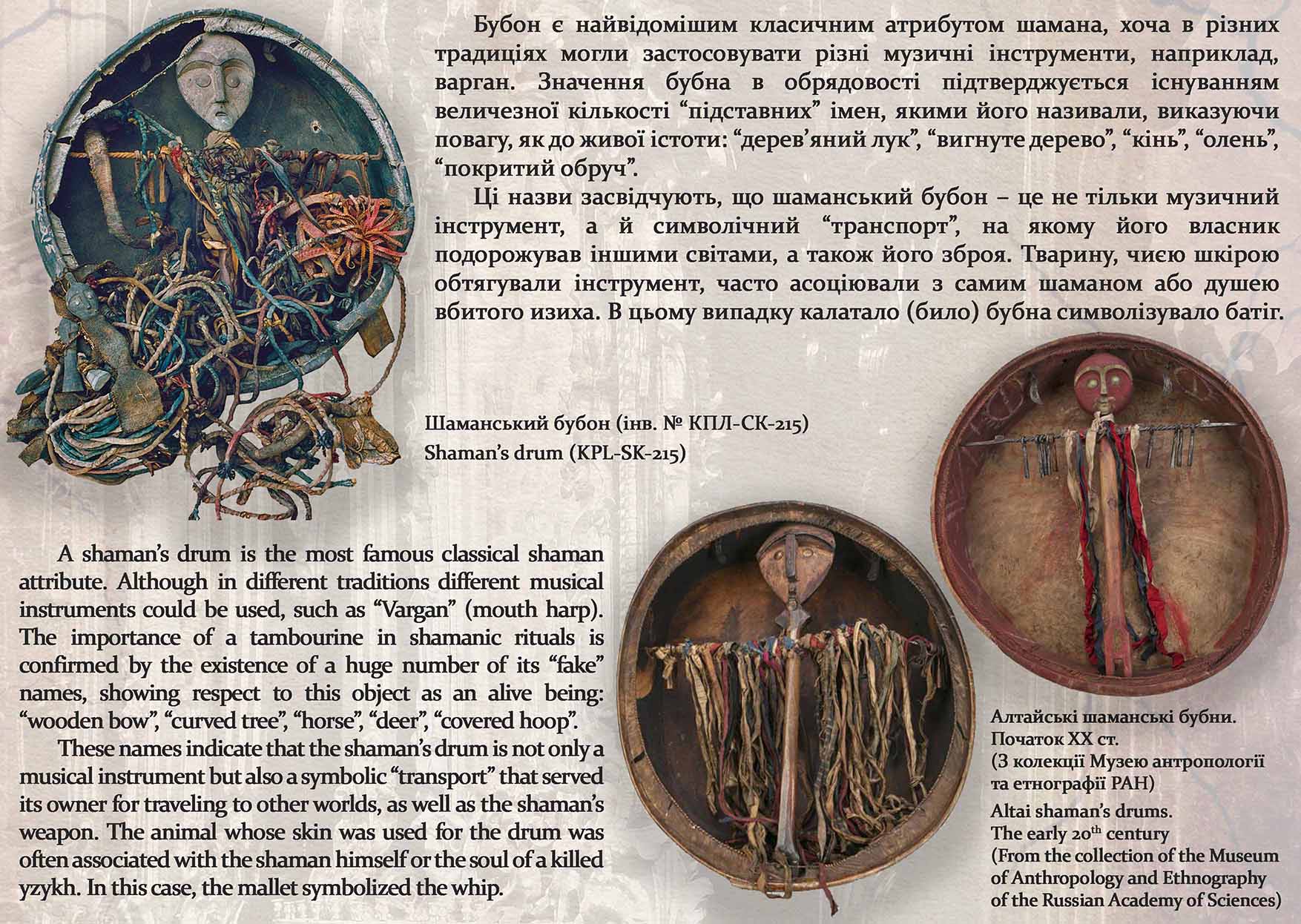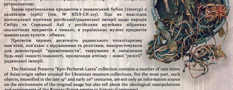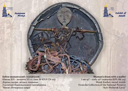 Ми продовжуємо випуск нашої постійної рубрики “Експонат місяця”. У світлі широкомасштабної війни, яку розгорнула проти України й українського народу російська федерація, доводиться по-новому оцінювати досить своєрідне історичне надбання, яке тим чи іншим шляхом потрапило до наших музеїв за імперських або радянських часів. Такі предмети, здебільшого, є взірцями певних ідеологічних маніпуляцій, якими досить активно користувалася імперська, а ще більше – тоталітарна більшовицька влада, і наслідком яких є й сьогоднішня російська агресія. Адже певні експонати використовувалися для демонстрації «примітивности» колонізованих народів, знецінення їхнього культурного надбання з метою подальшого нівелювання та створення штучної ідентичності «радянської людини». Представляємо вашій увазі досить оригінальний предмет, особливо як для українського музею – шаманський бубон (тюнгур) з калаталом, який надійшов до колекції Національного заповідника «Києво-Печерська лавра» в 1920-ті роки.