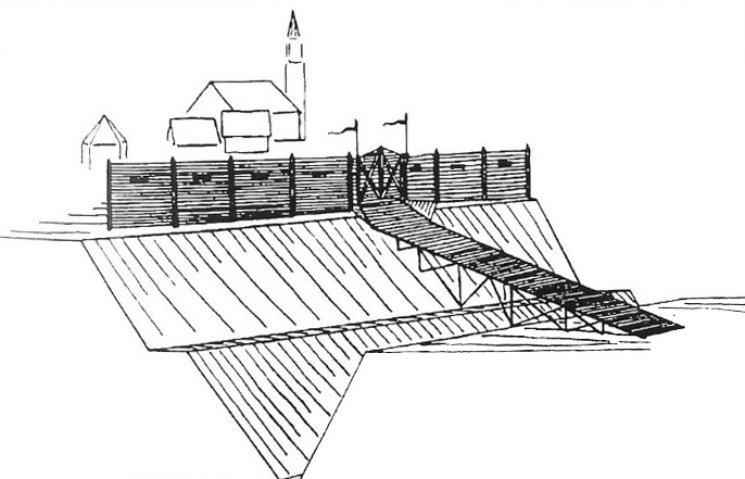 З писемних джерел відомо про будівництво у 1073–1078 рр. навколо Печерського монастиря огорожі: “А ігумен і братія заложили церкву велику, і монастир обгородили стовп’ям”. В академічній літературі стовп’є – це дерев’яна фортифікаційна конструкція у вигляді вертикально поставлених колод (іл. 1а, 1б). Фактично одночасно огорожа з подібною назвою захищала в Києві Поділ з північно-західного боку та Дмитріївській монастир. Достеменно невідомо, як виглядала подібна конструкція, але напевно міцніше, ніж просто паркан (іл. 2, 3) і можливо складніше, ніж звичайний ряд колод (іл. 4).