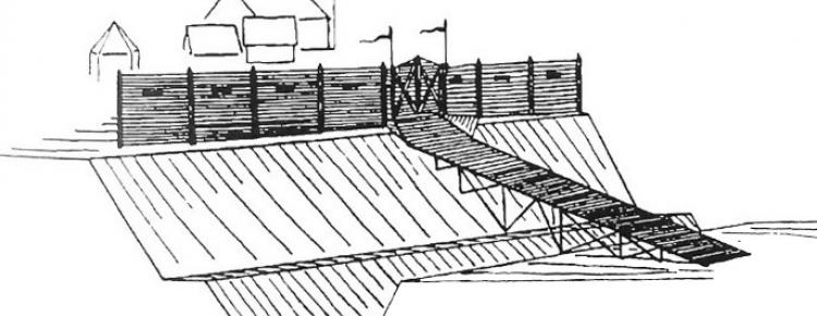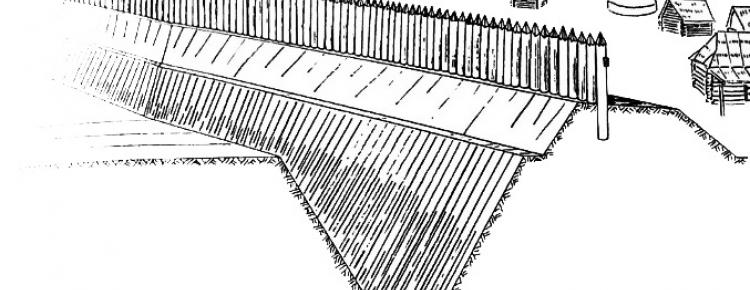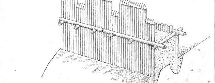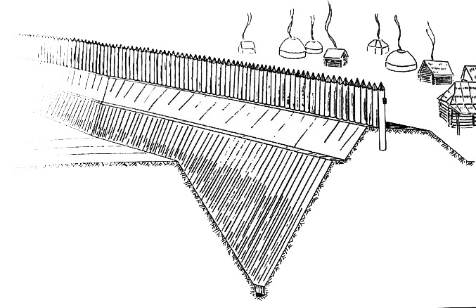 Іл. 5. Реконструкція стовп’я у вигляді оборонної дерев’яно-земляної стіни. Вигляд з боку поля. Малюнок В. Лук’янченка