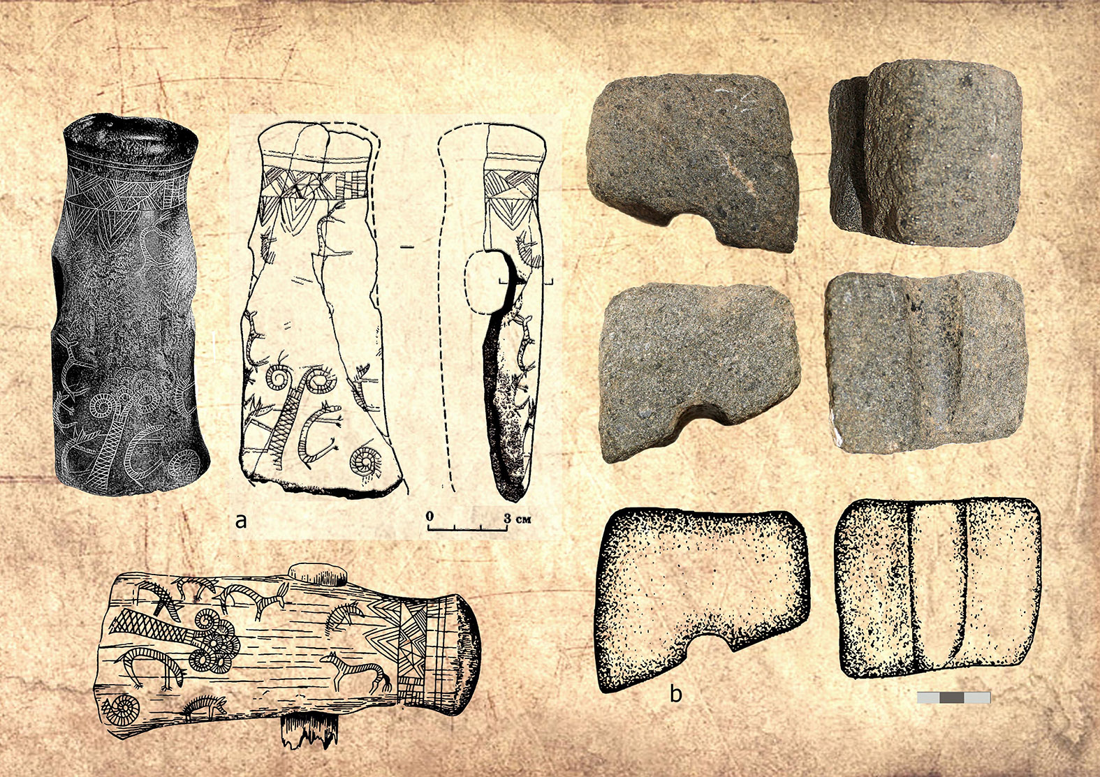 Така зброя набула значного поширення не лише на степових просторах Східної Європи, окремі його компоненти зустрічаються і в лісостепових комплексах. Серед знахідок з чорноліських городищ та поховань є біметалічні мечі, вістря стріл і списів, а також кам’яні молоти (іл. 4). На Київщині відома знахідка кіммерійської рогової сокири з графічними зображеннями (іл. 5, a). На території Національного заповідника «Києво-Печерська лавра» у 2017 р. під час розкопок в Митрополичому саду було знайдено зразок кіммерійської зброї – уламок заготовки для кам’яного бойового молоту (іл. 5, b; 6).