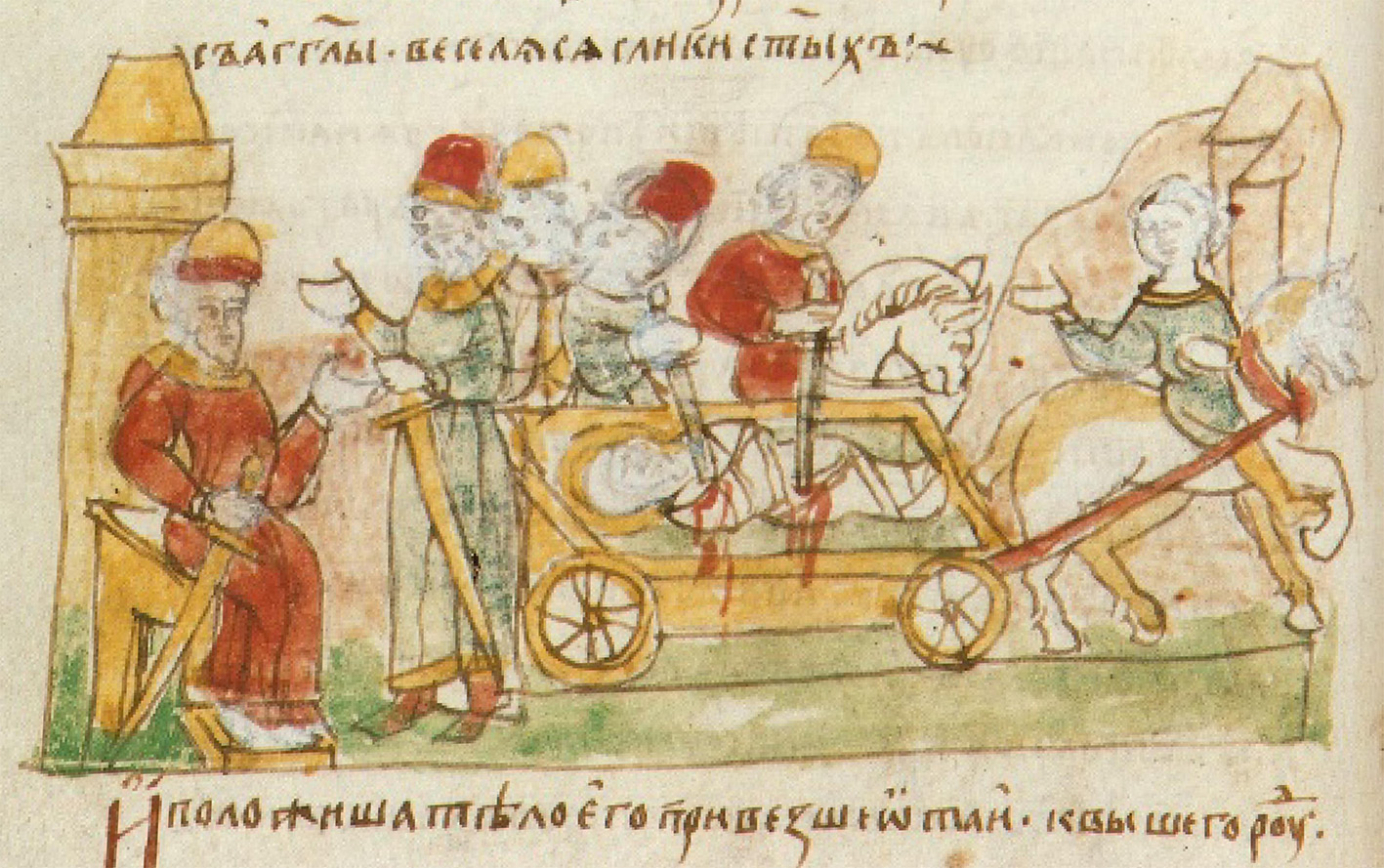 Борис же, повернувшись, і не знайшовши поган, і була йому вість про батька. І плакав вельми по вітцю. Був бо любимий батька більше від усіх. І прийшовши, став на Альті**. І розпустив воїнів своїх, говорячи: “Якщо батько мені помер, то будь мені, Святополку, замість батька”. Святополк же виповнився заздрістю і беззаконням. Каїнової думки набувши, послав брехливо до нього. І потім той зазвав вишгородців, порадився (з ними) і каже: “Пішовши, убийте брата мого Бориса”. Вони ж, отже, швидко пішли на Альту поночі. І чують, як блаженний Борис бере участь у Заутрені. Була йому вість, що хочуть його убити. І поглянувши на ікону Святої Богородиці, на Образ Владики, помолився, плачучи, говорячи таке: “Господи, Ісусе Христе, Котрий, як на цьому образі, задля Спасення нашого, зволив своєю волею прибитися на Хресті рукам своїм, і муку прийняв задля гріхів наших. Так і мене сподоби прийняти муку – не від ворогів, але от свого брата, і вбачай йому в цьому гріха”. Як помолився він, ліг на ложі своєму. І тут напали, мов звірі. І прохромили блаженного Бориса і слуг його перебили. І загорнули Бориса у шатро, повезли його швидко. І ще ж дихав. Дізнавшись (про це) окаянний (Святополк) – послав двох воїнів. Один же вийнявши меча, прохромив його в серце. І так помер блаженний Роман. Таким бо іменем наречений був у Хрещенні. І прийняв вінець від Христа Бога, і до праведних долучився, з пророками і апостолами, і з мучениками, веселиться з ангелами і почиваючи в лоні Авраамовому***.