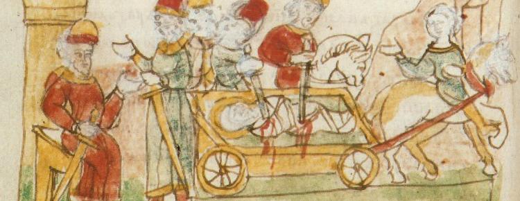 Іл. 1 “Подвійний” малюнок, традиційний для Радзивілівського літопису – з’єднання двох сюжетів: Святополк посилає варягів; св. Бориса добили