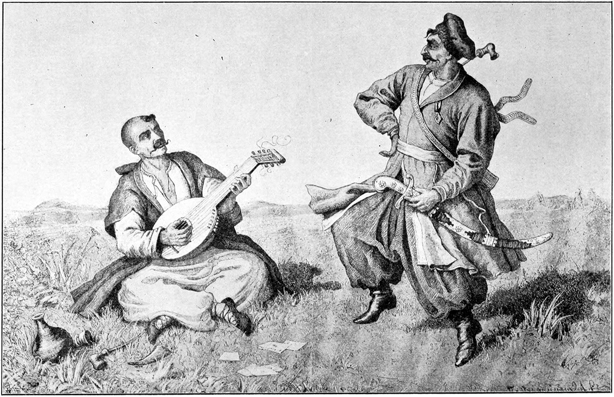 Іл. 4. Літографія “Дозвілля козаків” за аквареллю Тимофія Калинського, опублікована у “Мазепі” Альфреда Йенсенса, 1909 р.