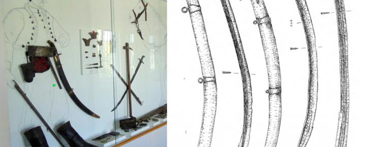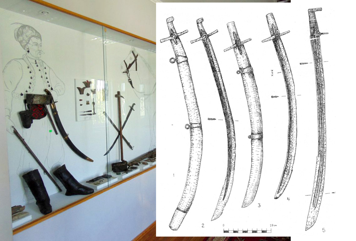 Іл. 7. Козацька зброя XVII ст. в експозиції Національного історико-меморіального заповідника “Поле Берестецької битви” і зображення знайдених шабель з-під Берестечка (1-2 – угорсько-польська шабля ІІ типу)