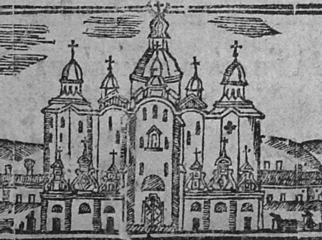 1. Успенський собор на титульному аркуші книги “Пречестныи акафисты всесердмичныи...”, видання Києво-Печерської друкарні, 1677 р. Дереворит. Гравер Афанасій К.