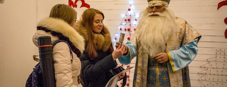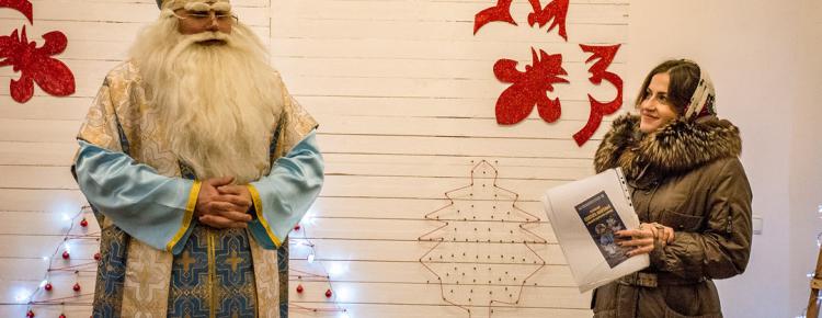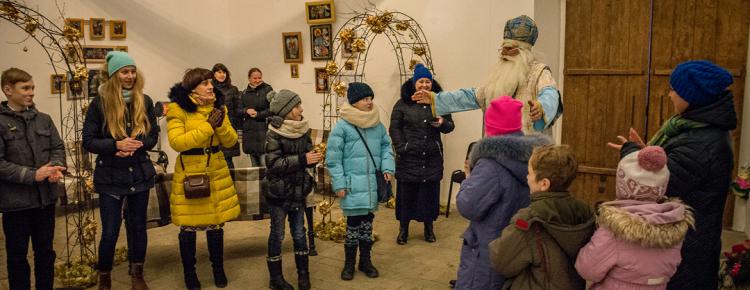 Праздник награждения начался со встречи детей с начальником отдела музейно-образовательной работы заповедника Олег Топилко в образе Святого Николая и его помощницы – сотрудницы музейного комплекса Елены Балабановой. Дети позвали главного виновника торжества, и хозяин Резиденции поздравил маленьких гостей тематическими стихами и словами благодарности за участие в конкурсе.