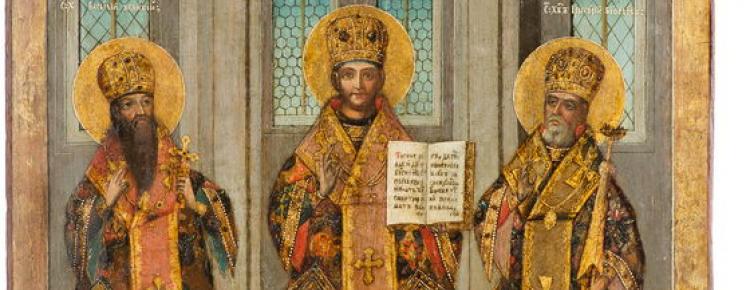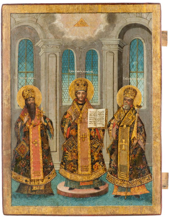 Київський храм, що був закладений ще 1183 року, у ХVІІ ст. за часів Петра Могили освятили на честь трьох ієрархів – провідних вчителів віри, святості й науки Христової Церкви – свтт. Василія Великого, Іоанна Золотоустого і Григорія Богослова (Трьохсвятительська церква). Їх вшанування віддзеркалено в мистецтві, зокрема, і в українському іконописі.