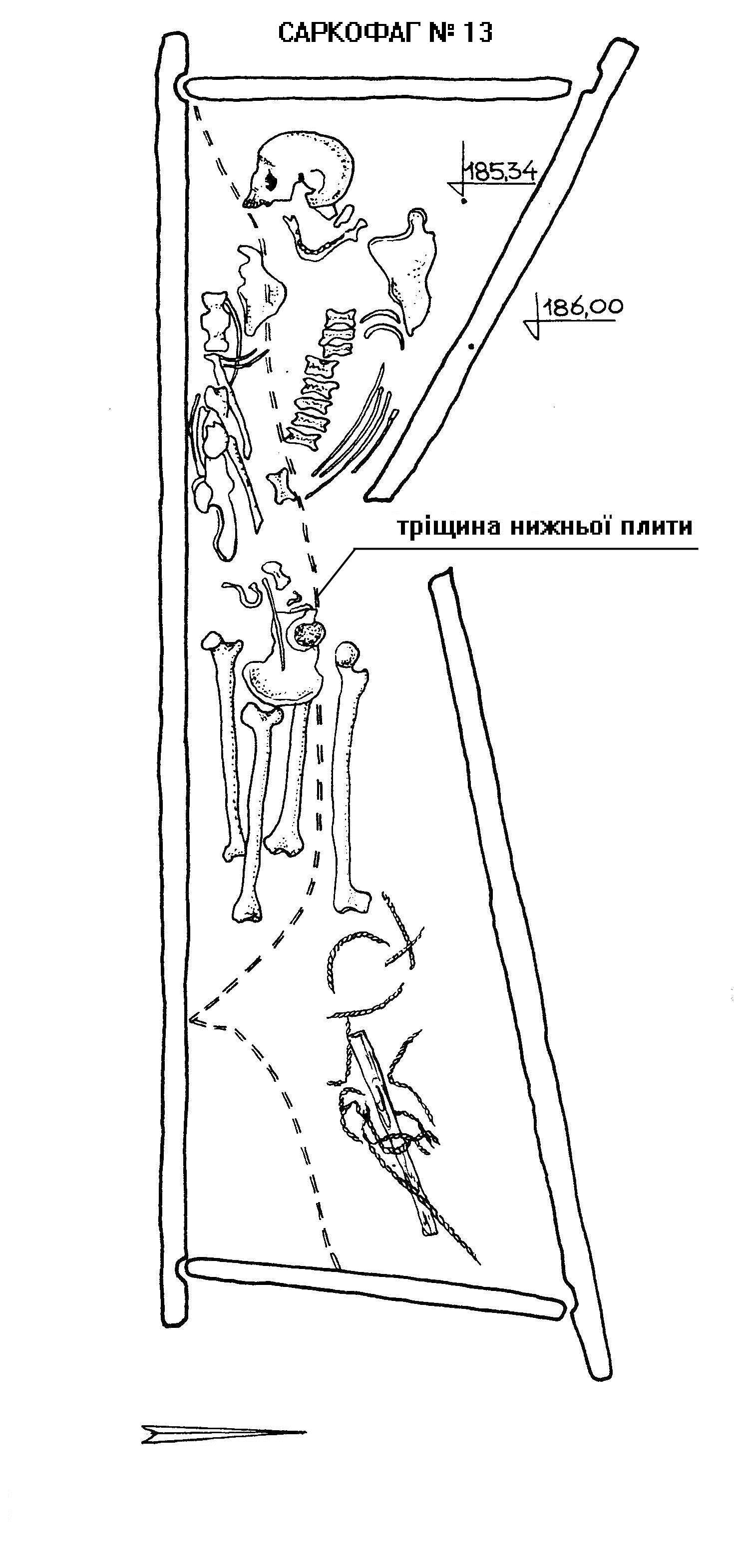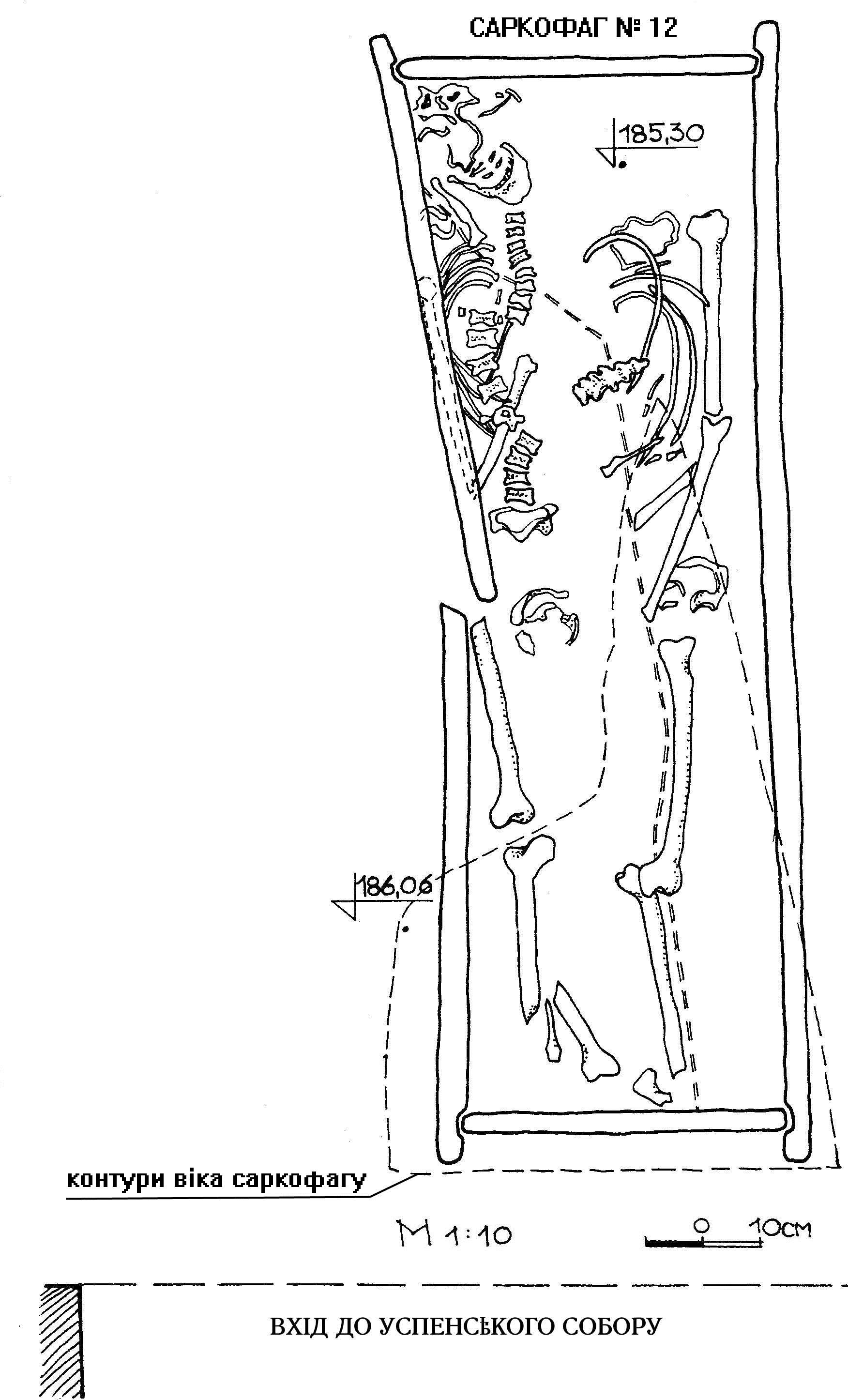 Всі вони, безперечно, давньоруського походження, що не можна стверджувати відносно самих поховань, які, переважно, є вторинними (тобто, з’явилася в саркофагах набагато пізніше встановлення останніх). Одночасність захоронення та поховальної споруди можна припустити лише для двох північних (№ 12-13) саркофагів західного порталу собору (іл. 3, 4).