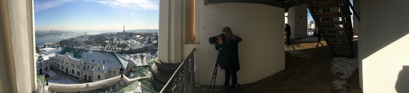 4. Молоді митці в процесі творчості. Панорамний погляд на лаврські споруди і річку Дніпро. Фото М. Ткаченко, 2017 р.