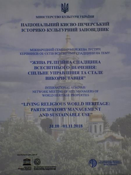 31 жовтня – 1 листопада 2018 року у приміщенні ДП «Генеральна дирекція з обслуговування іноземних представництв» у онлайн режимі пройшов Міжнародний семінар/мережевої зустрічі керівників об’єктів всесвітньої спадщини на тему «Жива релігійна спадщина всесвітнього значення: спільне управління та стале використання».