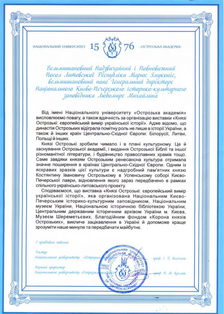 » Подяка Національного університету «Острозька академія» за організацію виставки «Князі Острозькі: європейський вимір української історії»