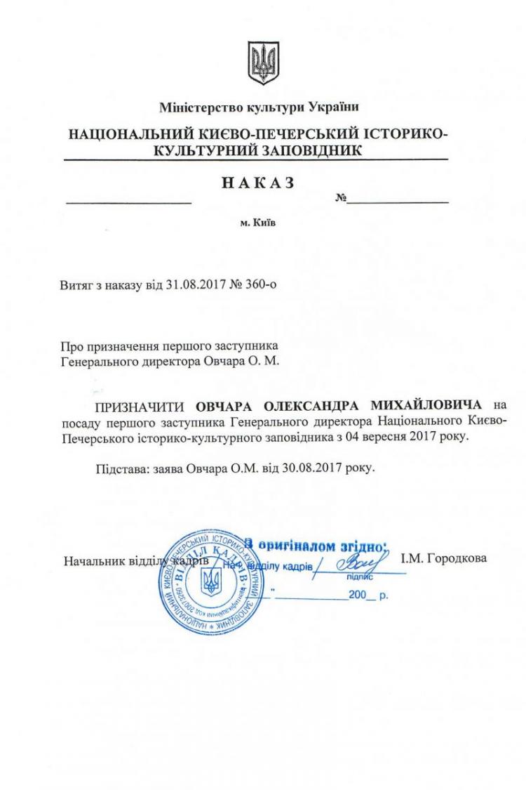 Наказ про призначення першого заступника Генерального директора Національного Києво-Печерського історико-культурного заповідника
