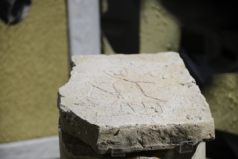 Цеглу знайшли під час розбору руїн Успенського собору у 1950-х роках. Вона є свідченням “вуличного мистецтва” тисячолітньої давнини. Обидва експонати створюють міст між сучасним протестом і творчим висловлюванням київських майстрів XI