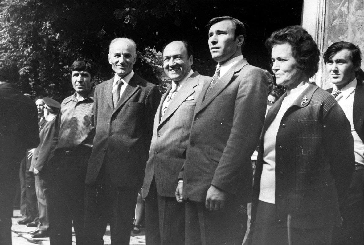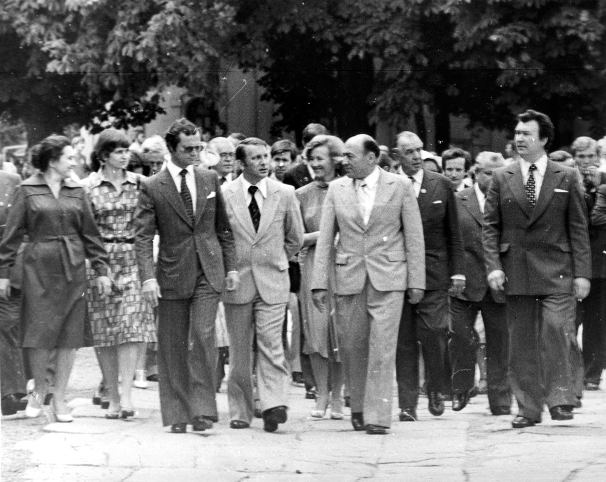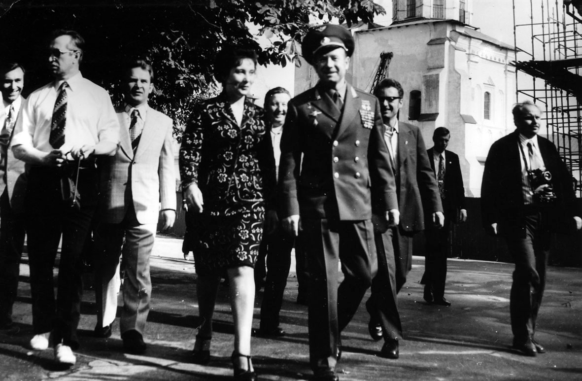 09. Астронавти США Венс Бранд (ліворуч) та Томас Стаффорд (праворуч, у формі). Між ними – заступник директора заповідника М. З. Петренко