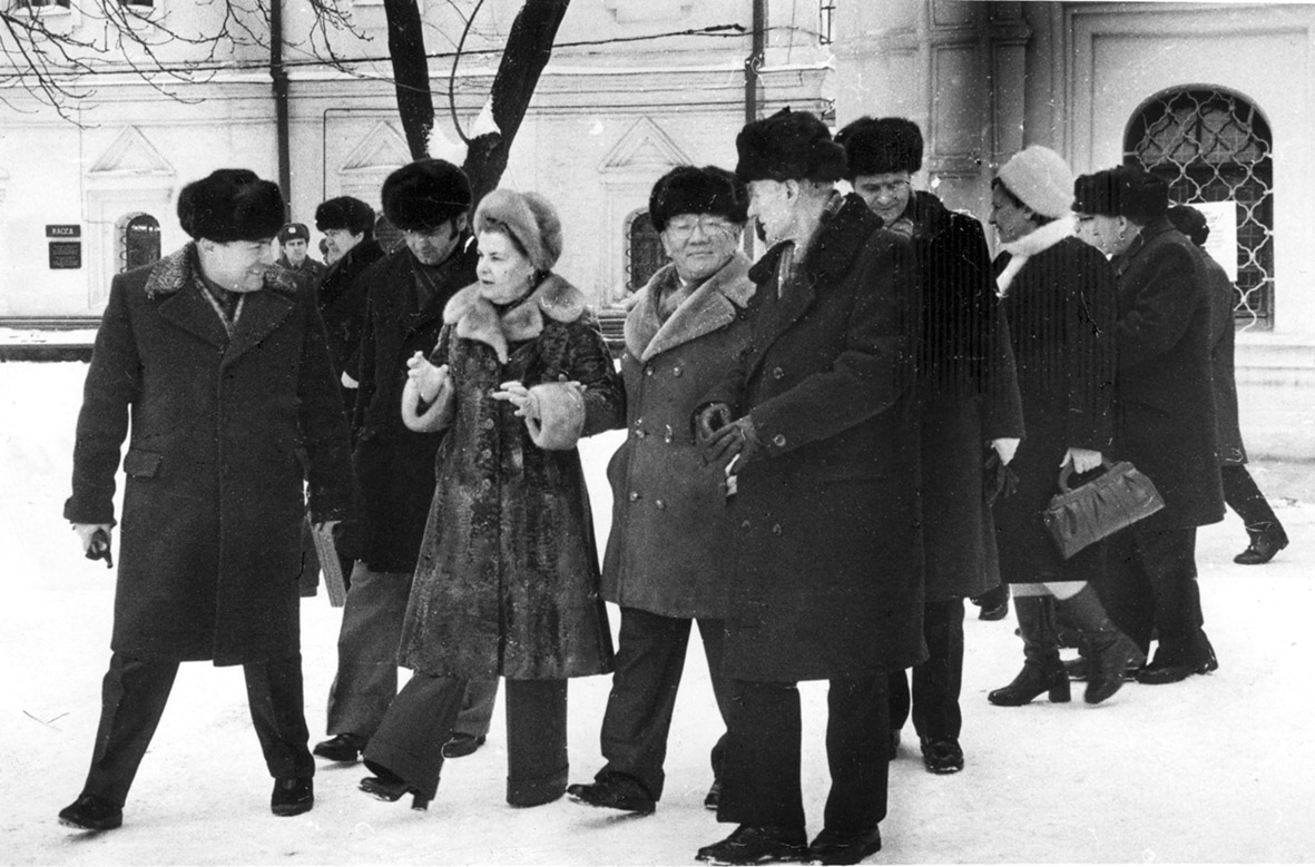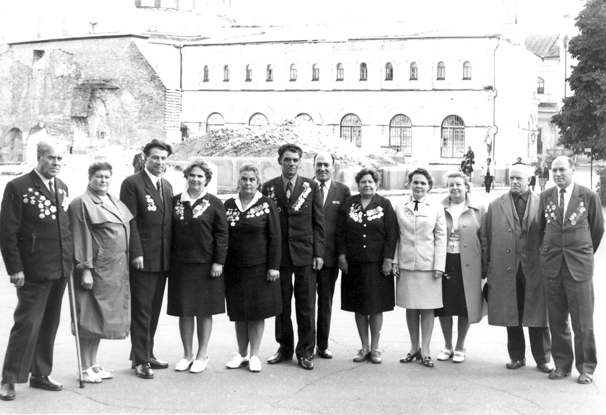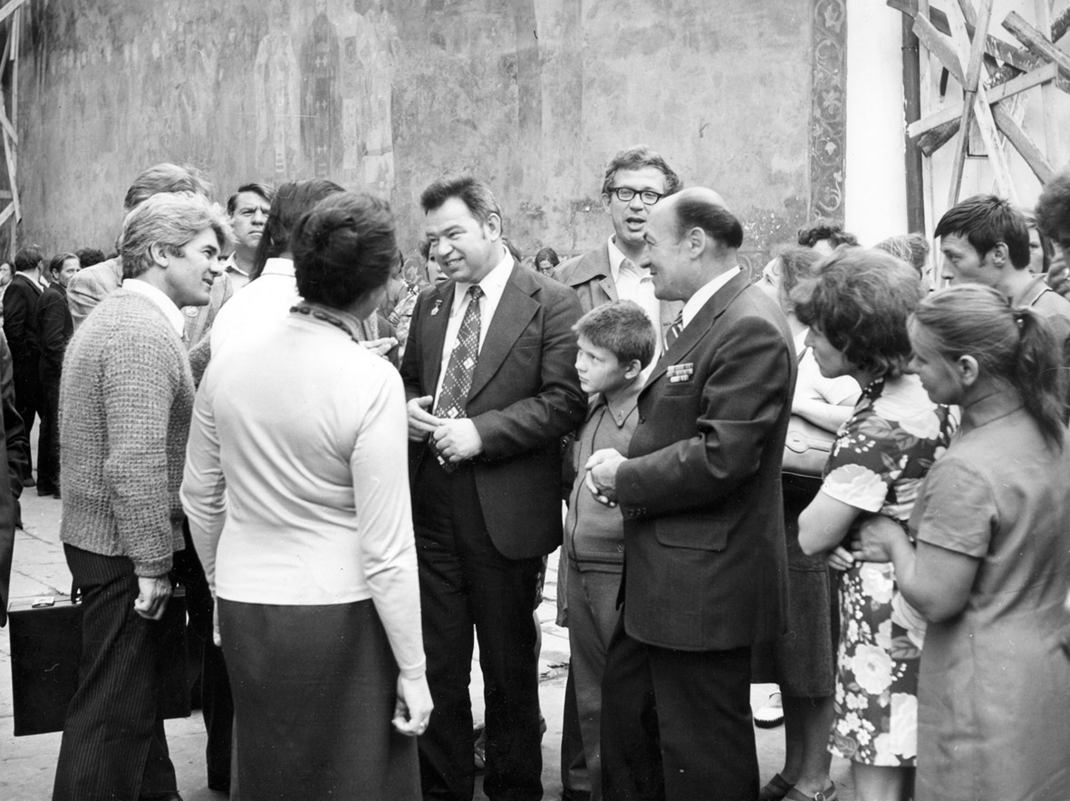 01. В очікуванні високих гостей. Зліва направо: другий – М. З. Петренко, заступник директора заповідника з наукової роботи; А. Г. Шостя, директор Києво-Печерського заповідника (1973–1979); Ю. Д. Кибальник, директор Києво-Печерського заповідника (1979–1995); О. Д. Ганіна, директор Музею історичних коштовностей