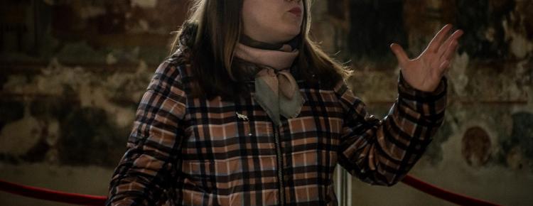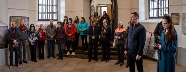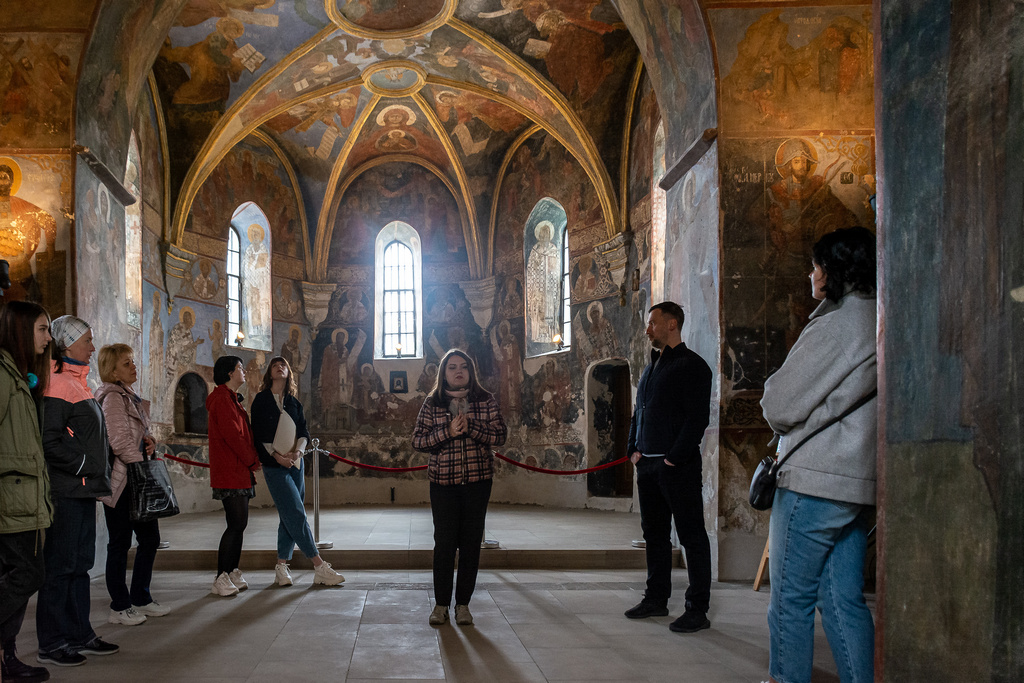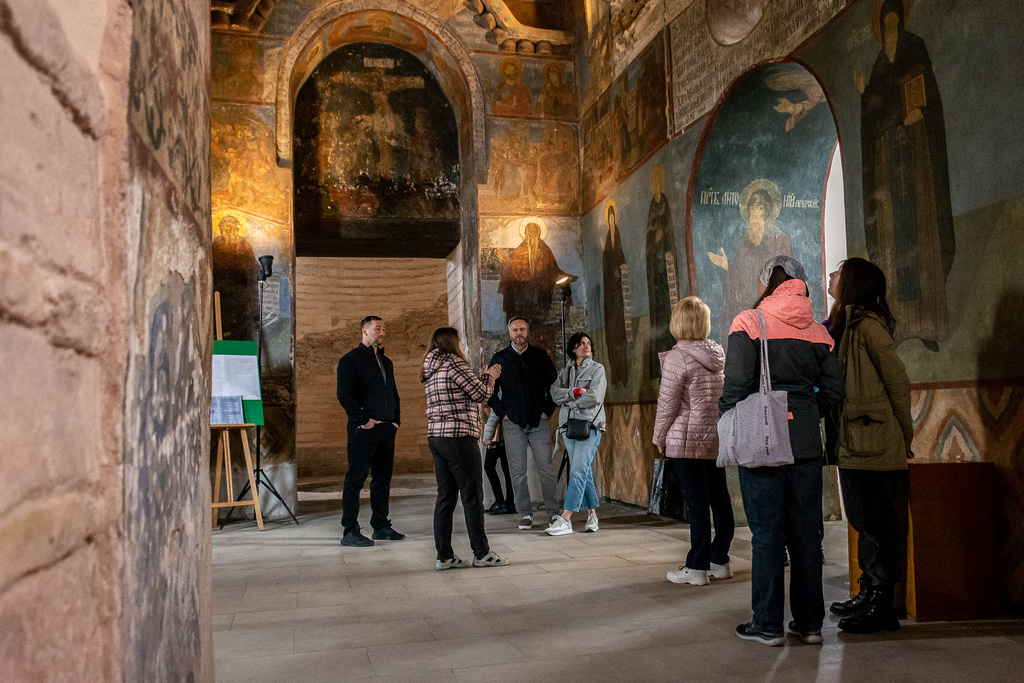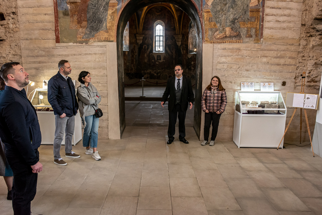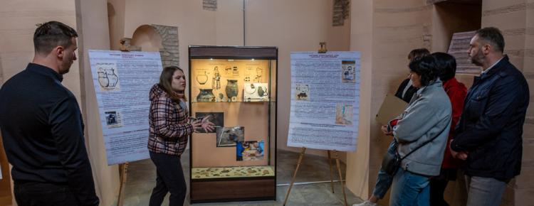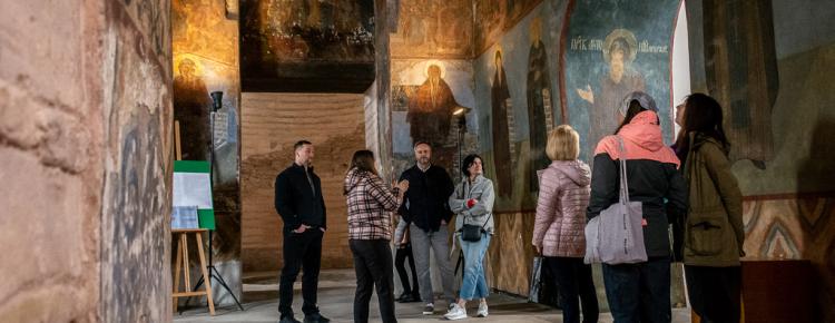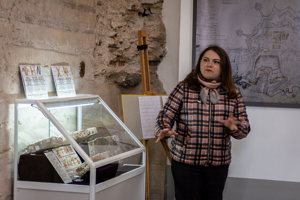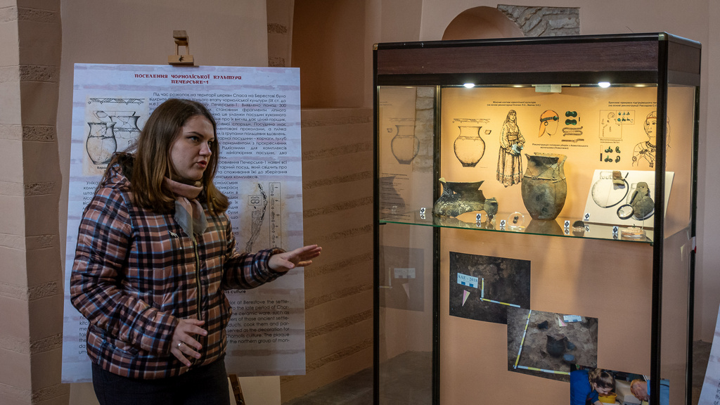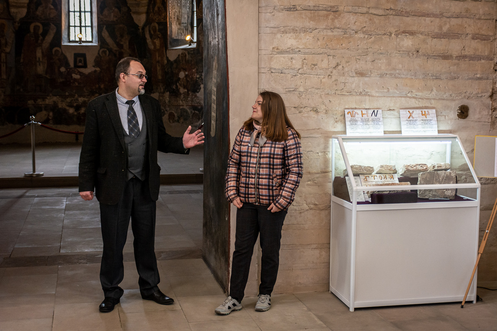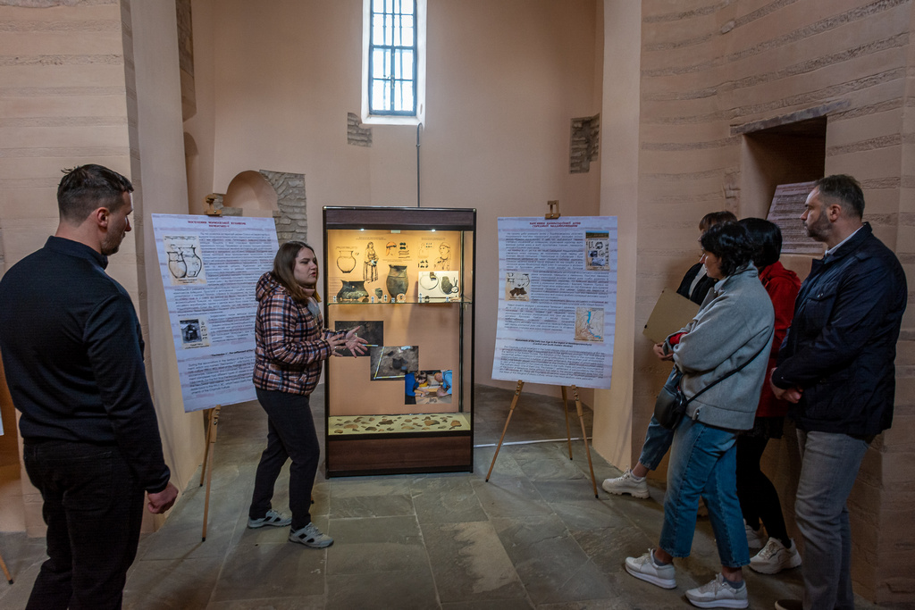 A new exhibition “Samples of Bricks of the Princely Era (Kniazha Doba) Found in the Territory of the Kyiv-Pechersk Lavra” was opened on April 29, 2022, in the narthex of the Church of the Savior at Berestove. The exposition highlights the history of the Lavra architectural ensemble in the 11th-12th centuries, as well as the development of civil engineering and the technology of making ancient bricks - plinths. Olena Makhota, the author of the exhibition and a research worker of the Scientific and Research Sector of Archeology, told the visitors about the most interesting exhibits displayed at the exhibition - samples of ancient bricks with unique end face marks and everyday life traces. All present also had the opportunity to listen to a thematic lecture tour dedicated to the archaeological research in the Church of the Savior at Berestove conducted in 2018 - 2019, given by Olena Makhota and Sergiy Taranenko, the Head of the Sector of Archeology.