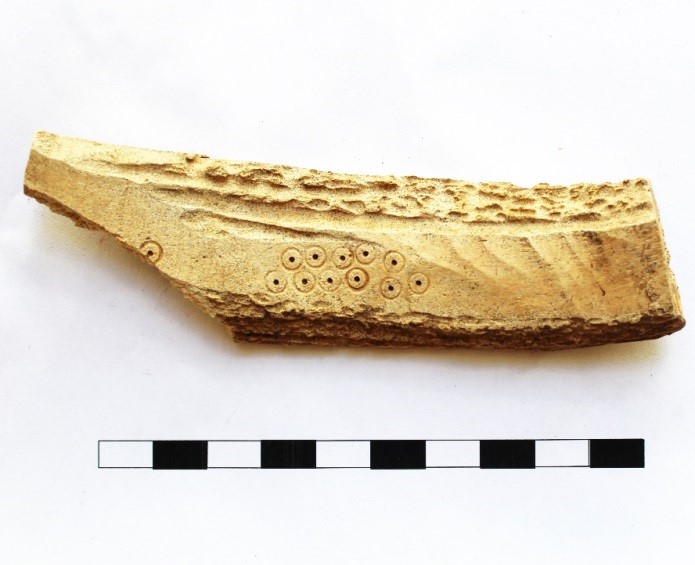 - фрагмент заготовки рукоятки ножа з рогу, орнаментований, ХІІ–ХІІІ ст.