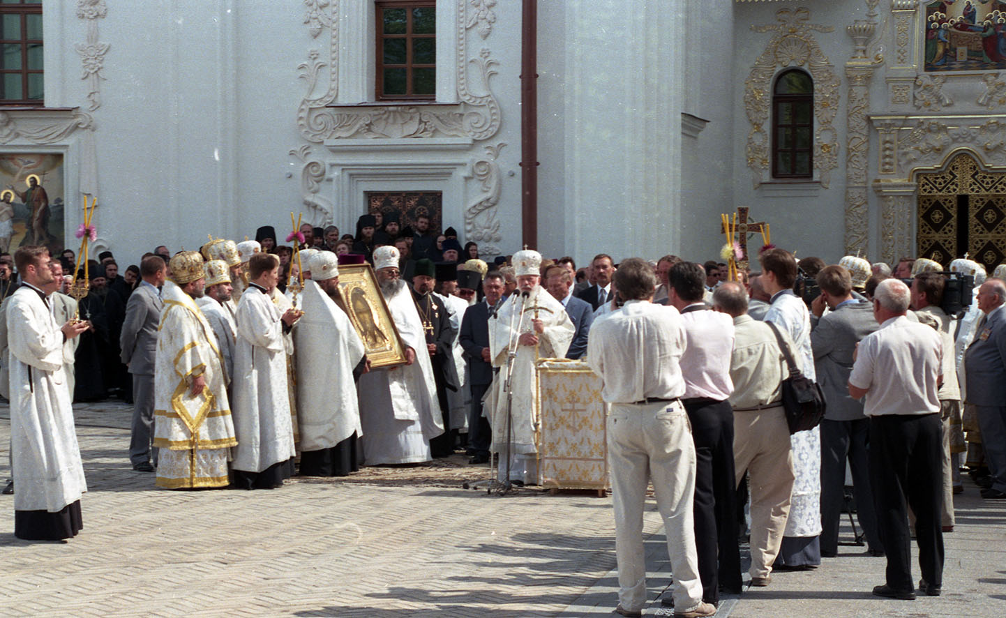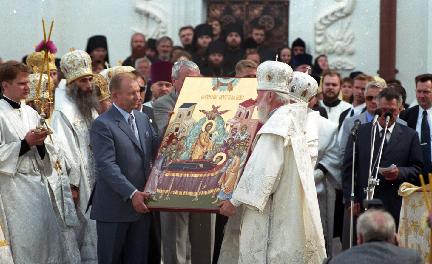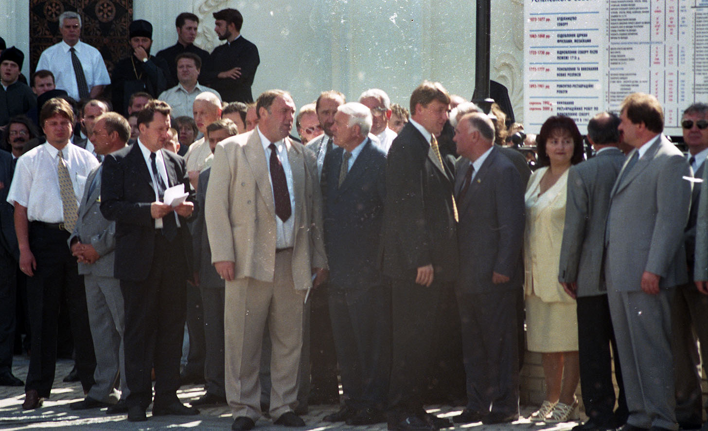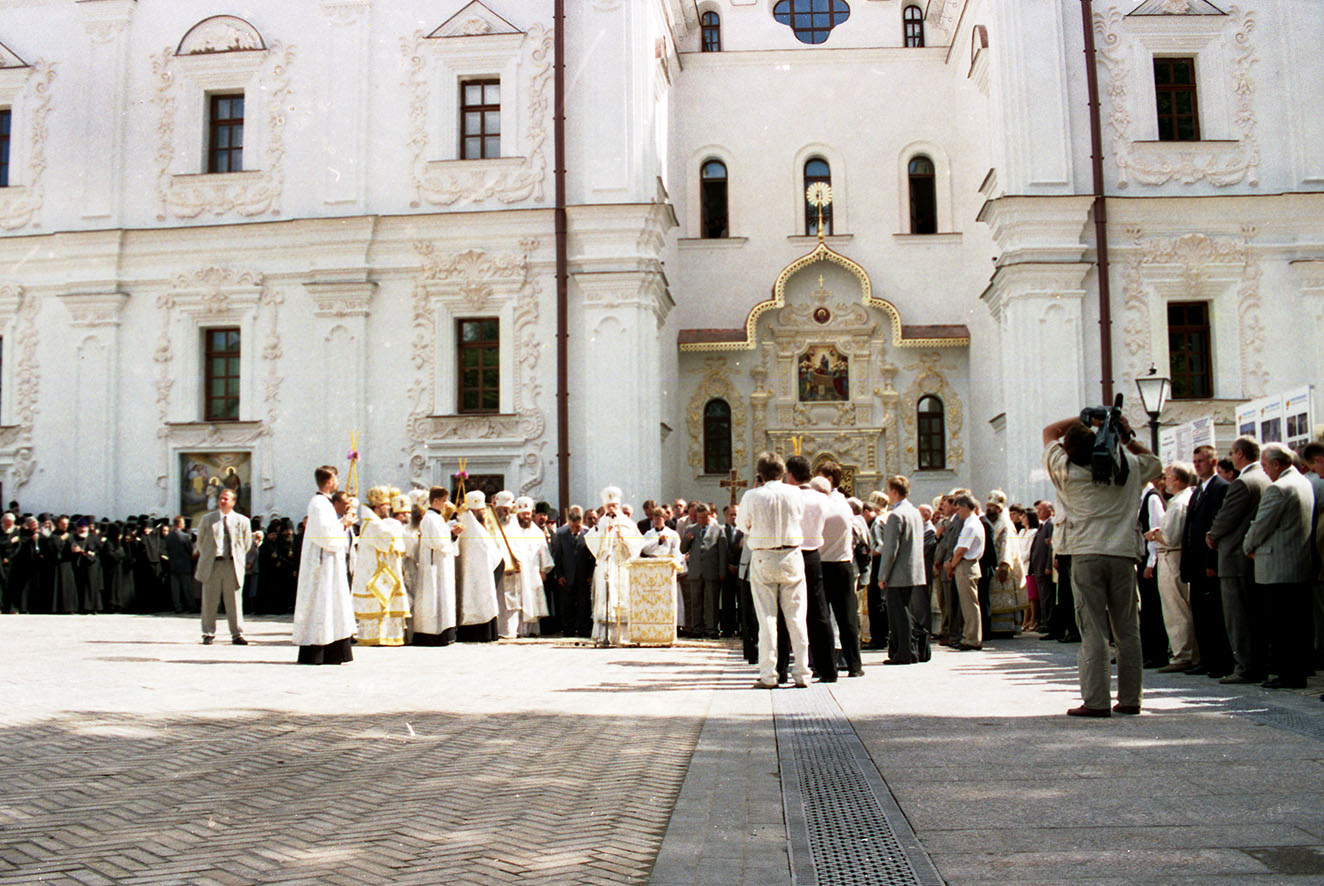 Leonid Kuchma, the President of Ukraine, Ivan Plyushch, the Chairman of the Verkhovna Rada (Supreme Council), Yuriy Yekhanurov, the First Deputy Prime Minister (then Prime Minister of Ukraine Viktor Yushchenko was out of Kyiv), Oleksandr Omelchenko, the Head of the Kyiv City State Administration, other officials, representatives of the clergy, believers and all those involved in the restoration of the main Lavra church visited the Kyiv-Pechersk Lavra on this day, the ninth anniversary of Ukraine's Independence. The consecration ceremony of the main altar of the Dormition Cathedral was conducted by the Primate of the Ukrainian Orthodox Church (Moscow Patriarchate) Volodymyr (Sabodan), the Metropolitan of Kyiv and All-Ukraine, in concelebration with Metropolitan Pavlo (Lebid), the Superior of the Holy Dormition Kyiv-Pechersk Lavra.