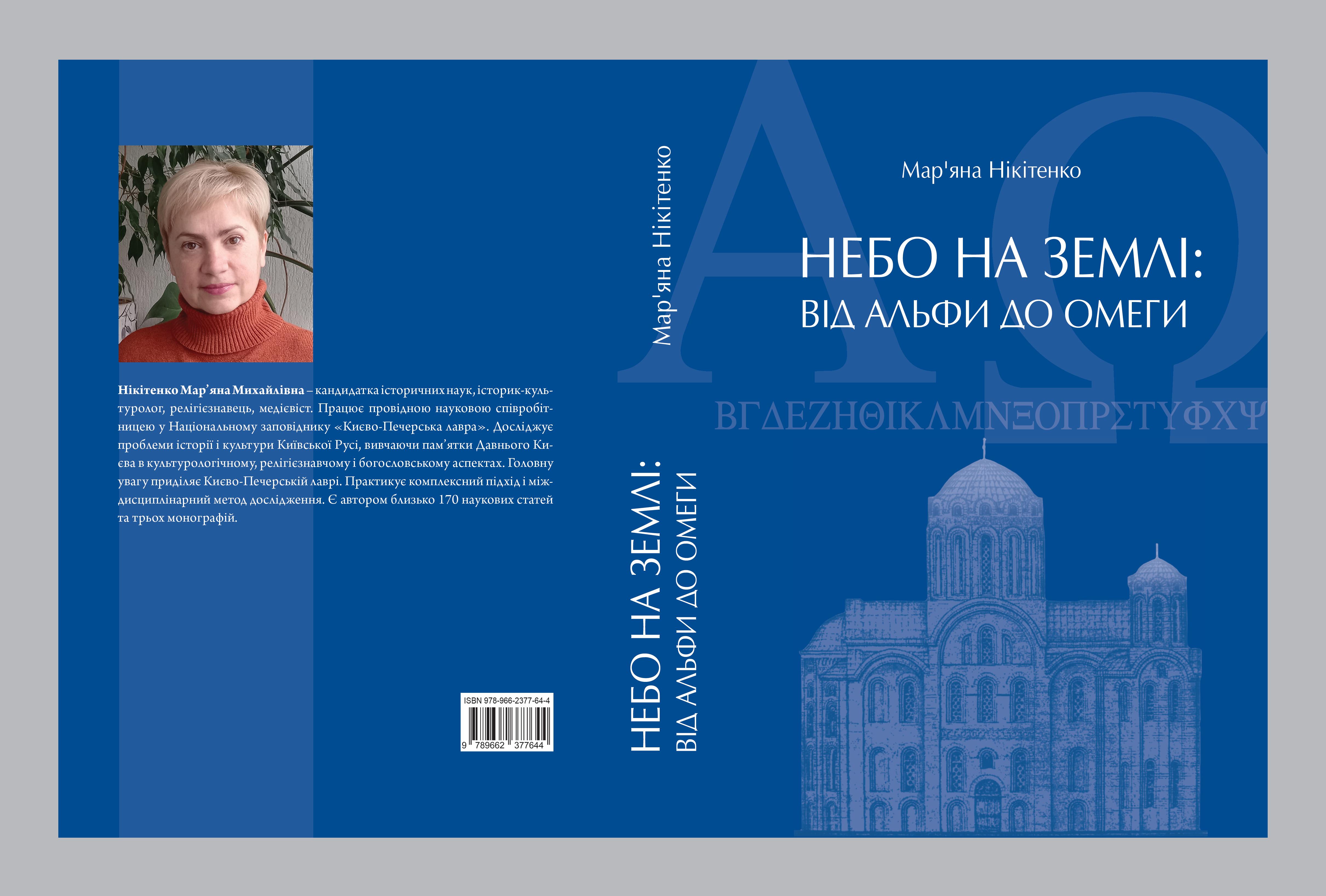 Раді повідомити, що 18 травня цього року світ побачила монографія кандидатки історичних наук, провідної наукової співробітниці Національного заповідника “Києво-Печерська лавра” Мар’яни Михайлівни Нікітенко. Назва книги: “Небо на землі: від Альфи до Омеги. Феномен Спасіння-освячення в Києво-Печерському монастирі (давньоруська доба)”. Вона присвячена історії ментальності будівничих раннього Києво-Печерського монастиря. У ній досліджено сприйняття давніми русичами процесу розбудови знаменитої чернечої обителі і, особливо, її головної святині – Великої Печерської церкви (Успенського собору).