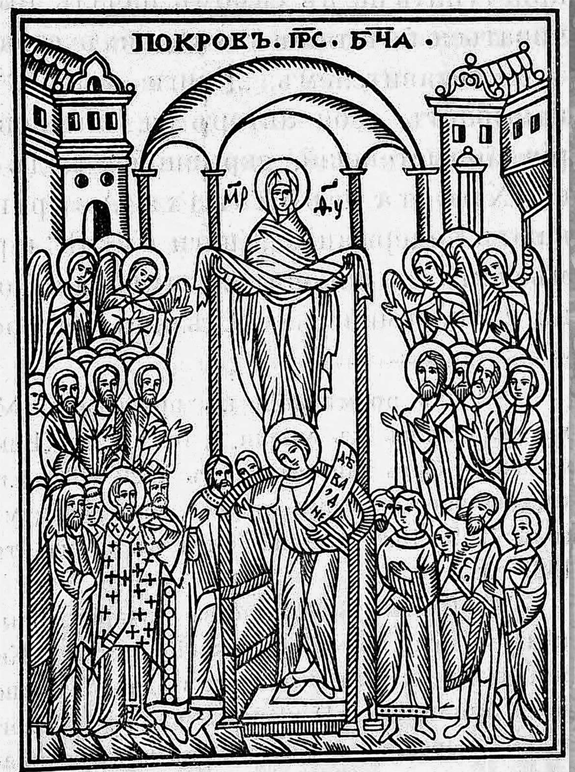 1. Гравюра “Покров Прсв. Богородиці” з книги “Анфологіон” 1619 р. Друкарня Києво-Печерської лаври