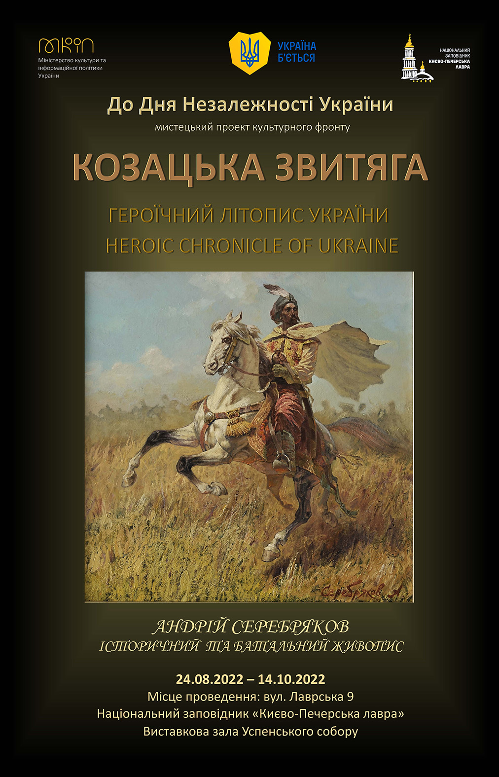 У День Незалежності України, 24 серпня 2022 р. о 13:00, у виставковій залі Успенського собору Національного заповідника “Києво-Печерська лавра” буде представлено мистецький проєкт культурного фронту “КОЗАЦЬКА ЗВИТЯГА. Героїчний літопис України” художника Андрія Серебрякова – українського майстра історичного та батального живопису.