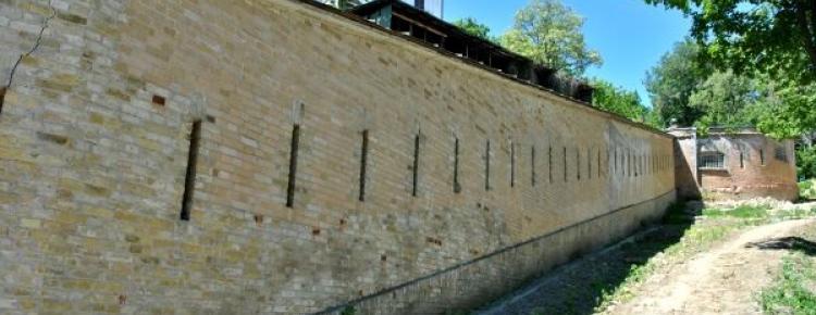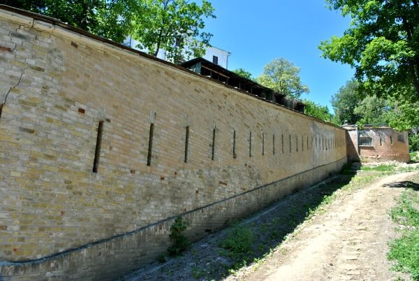Археологічні обстеження оборонної стіни проводилися у 2014, 2016, 2018, 2021 рр. У шурфі 2014 р., закладеному на одній з ділянок із західного боку мурів, було досліджено зовнішній обріз фундаментів стіни, який складався з двох елементів – горішнього основного (22 ряди з жовтої цегли) та нижнього субстратного (3 ряди мурування з рожевої цегли на слабкому вапняно-піщаному розчині) (іл. 2). Розміри цегли та її технічні характеристики дозволяють датувати субстратний горизонт фундаментної кладки більш раннім (в межах XVII–XVIII ст.) періодом, ніж час спорудження її основного об’єму. У 2016 р. біля північної торцевої стіни вдалося зафіксувати контури супровідного фундаментного рову середини XIX ст.