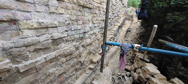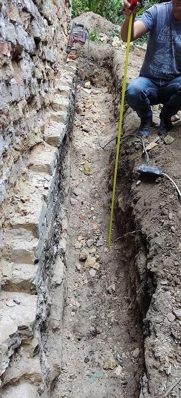 У 2021 р. окремі ділянки мурів досліджувалися в три етапи для вивчення підмурків поблизу північно-західного контрфорсу, рівня залягання фундаментів та оцінки їх стану (іл. 4). В нижній частині фундаментної групи зафіксовано посилення муру з цегли ХХ ст. – свідчення проведених ремонтних робіт (іл. 5-6).