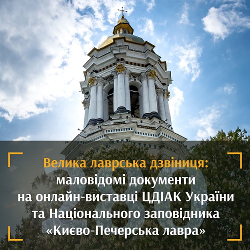 До 280-річчя Великої дзвіниці Києво-Печерської лаври та першої річниці Дзвону Пам’яті та Надії на сайті Центрального державного історичного архіву України, м. Київ відкрито онлайн виставку, яка презентує унікальні документи до історії цієї величної архітектурної пам’ятки.