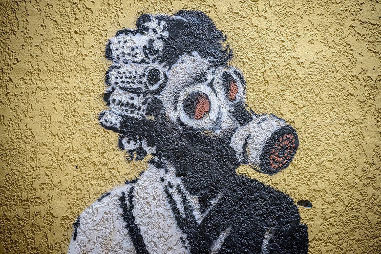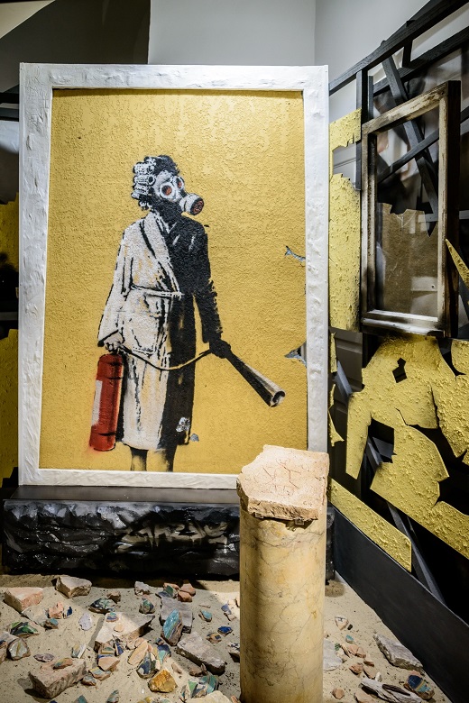 Малюнок Бенксі, зображує жінку в халаті, бігуді й протигазі, яка намагається загасити вогонь, спричинений агресією окупантів. Цей експонат створює цікаву паралель зі старовинною плінфою, на якій зображено малюнок людини у гордовитій позі. Реліквія довгий час зберігалася у фондовій колекції Заповідника.