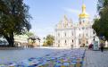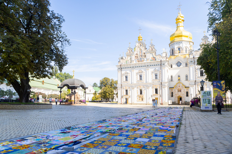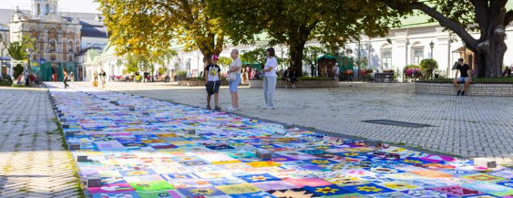 Біля Великої Лаврської дзвіниці розгорнули перші 600 метрів найбільшої у світі клаптикової ковдри “Sunflower Quilt For Ukraine – Печворк Перемоги”.