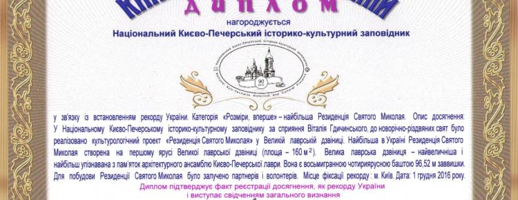 Во время торжественного открытия резиденции состоялось еще одно незаурядное событие – рекордсмен мира по паралимпийскому плаванию, депутат Киевского областного совета, председатель наблюдательного совета Национального проекта «Книги рекордов Украины» Олег Иваненко, а также представитель Книги рекордов Украины Игорь Пидчубий зафиксировали очередной рекорд Заповедника. Резиденция Святого Николая в Большой Лаврской Колокольне была признана самой большой Резиденцией Украины в категории «Размер». Представители Книги рекордов Украины поздравили инициаторов культурно-художественного проекта Почетными наградами.