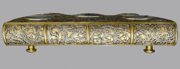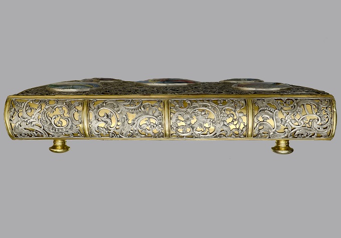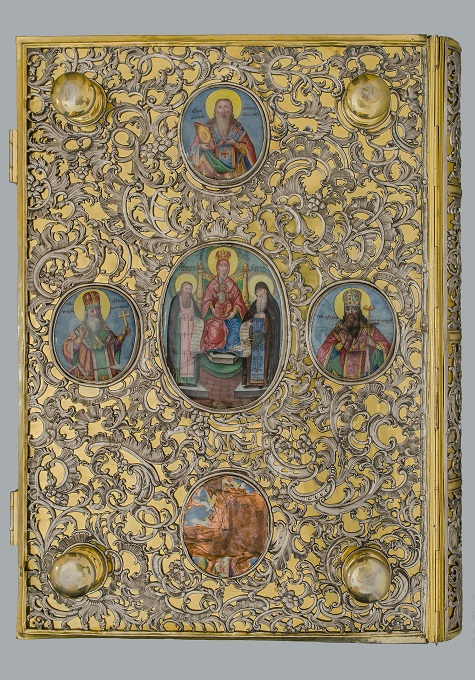 Мідну золочену з накладним срібним карбованим візерунком та фініфтевими медальйонами оправу виготовив у 1770-ті роки видатний майстер срібних справ Олексій Іщенко. Нещодавно її було відреставровано художником-реставратором Заповідника Віталієм Курловим, а минулого року представлено на виставці, присвяченій гетьману І. С. Мазепі.