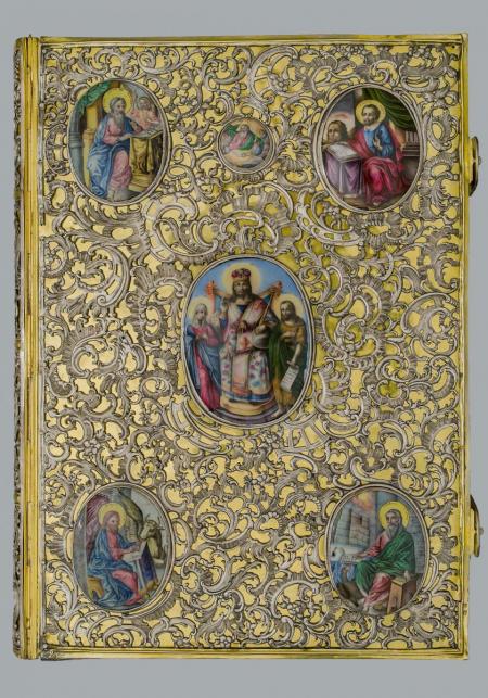 Мідну золочену з накладним срібним карбованим візерунком та фініфтевими медальйонами оправу виготовив у 1770-ті роки видатний майстер срібних справ Олексій Іщенко. Нещодавно її було відреставровано художником-реставратором Заповідника Віталієм Курловим, а минулого року представлено на виставці, присвяченій гетьману І. С. Мазепі.