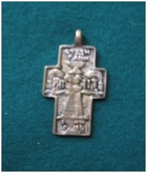 У порівнянні з масивом металевих натільних та наперсних хрестів XVI–XVIII ст., знайдених на археологічних пам’ятках, дерев’яні трапляються нечасто й, здебільшого, зображення на них лаконічні або відсутні. На цьому тлі наш хрест виділяється своєю насиченою іконографією. Він чотирикінцевий, розмірами 4,7×2,7 см, пропорційно наближений до «латинського» типу, однак його горизонтальна балка значно коротша ніж в цій усталеній пропорції (іл. 2). Відомі металеві натільні хрести таких форм та пропорцій датують XVIII ст. (іл. 3).