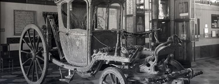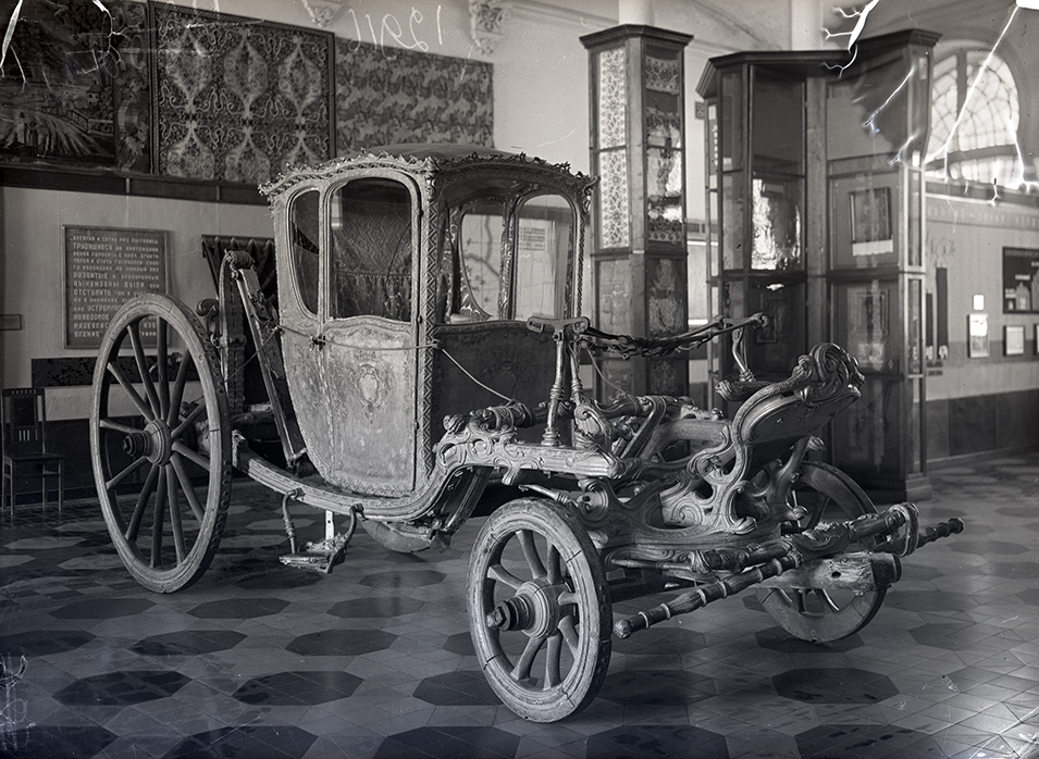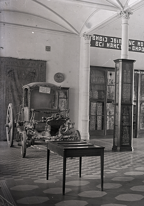 1. Карета київських митрополитів у експозиції відділу шиття й тканини Всеукраїнського музейного городка. Початок 1930-х рр. [НКПІКЗ, інв. № КПЛ-Н-3067]