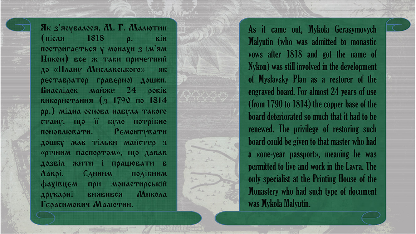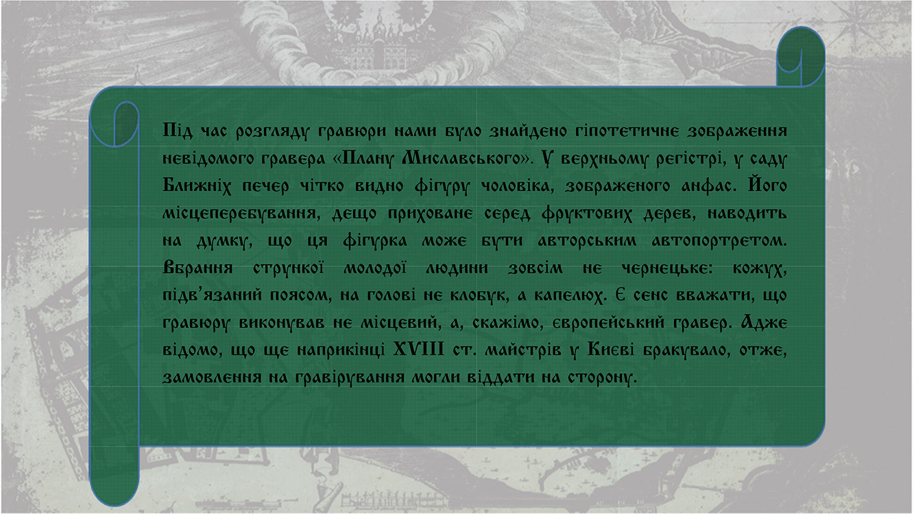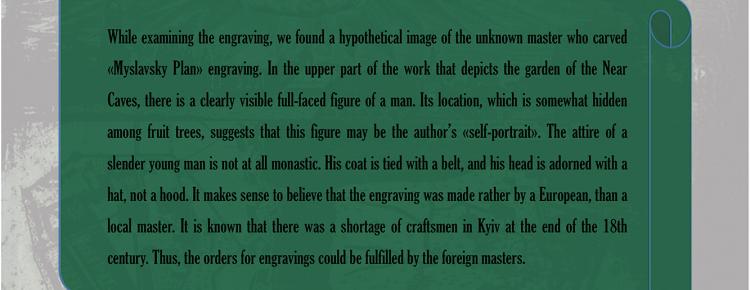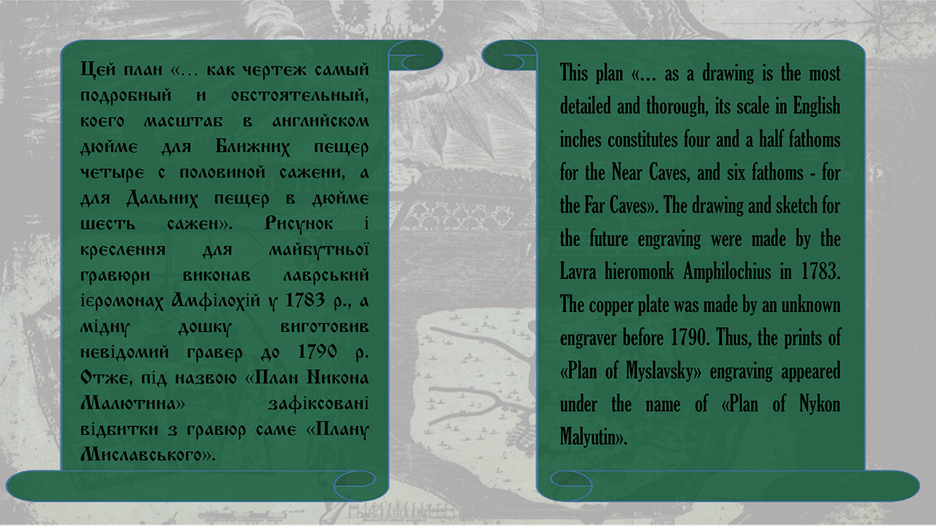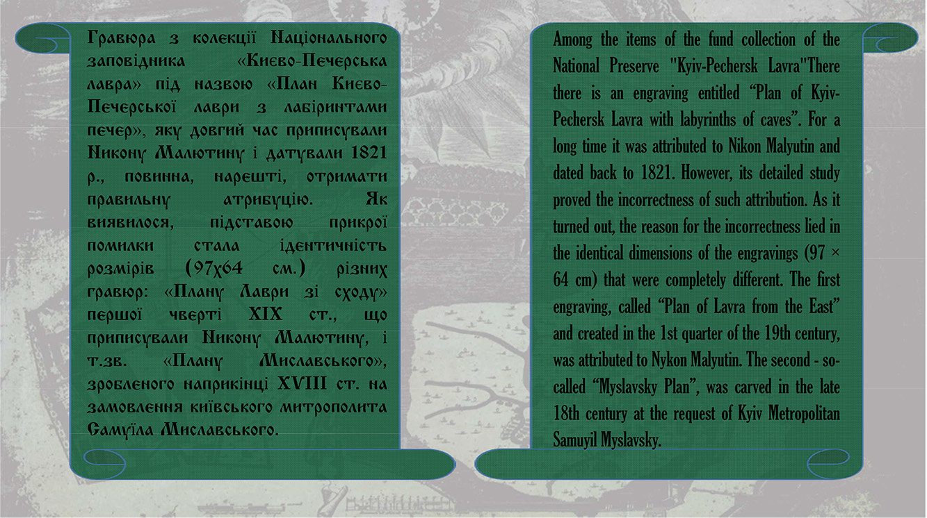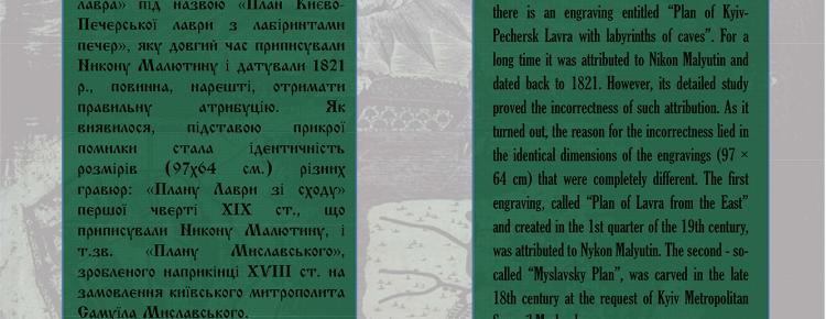Раді представити до вашої уваги черговий випуск «Експоната місяця». Сьогодні ми презентуємо гравюру «План Києво-Печерської лаври з лабіринтами печер» з колекції Національного заповідника «Києво-Печерська лавра». Автором гравюри тривалий час вважали лаврського ченця Никона Малютина й, відповідно, датували її 1821 р. Насправді, гравюра була виконана на замовлення київського митрополита Самуїла Миславського до 1790 р. Автором її малюнка був лаврський ієромонах Амфілохій.