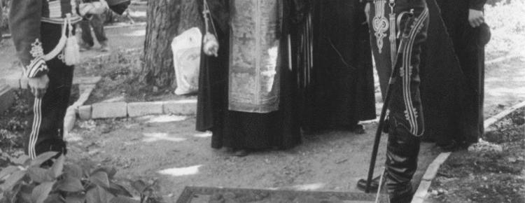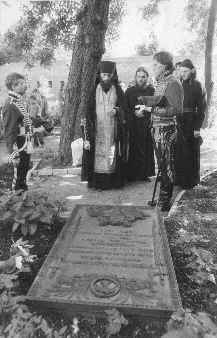 15-16. Молебні над могилою генерал-фельдмаршала Ф.В. Остен-Сакена. На фото 15: ієромонах Даміан, ініціатор відновлення кладовища