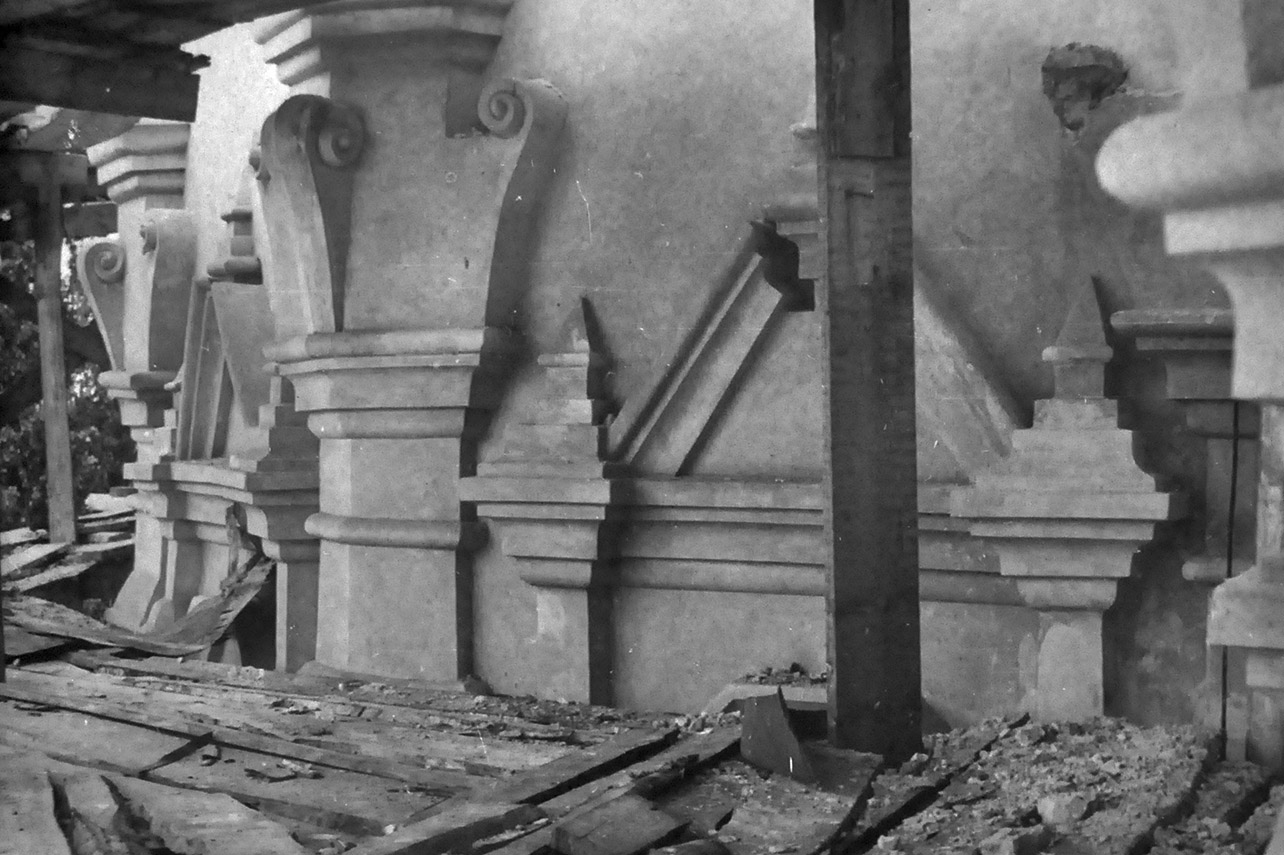16. Завершення віконних отворів другого ярусу і кутових пілястр під час реставраційних робіт. 1959 р.