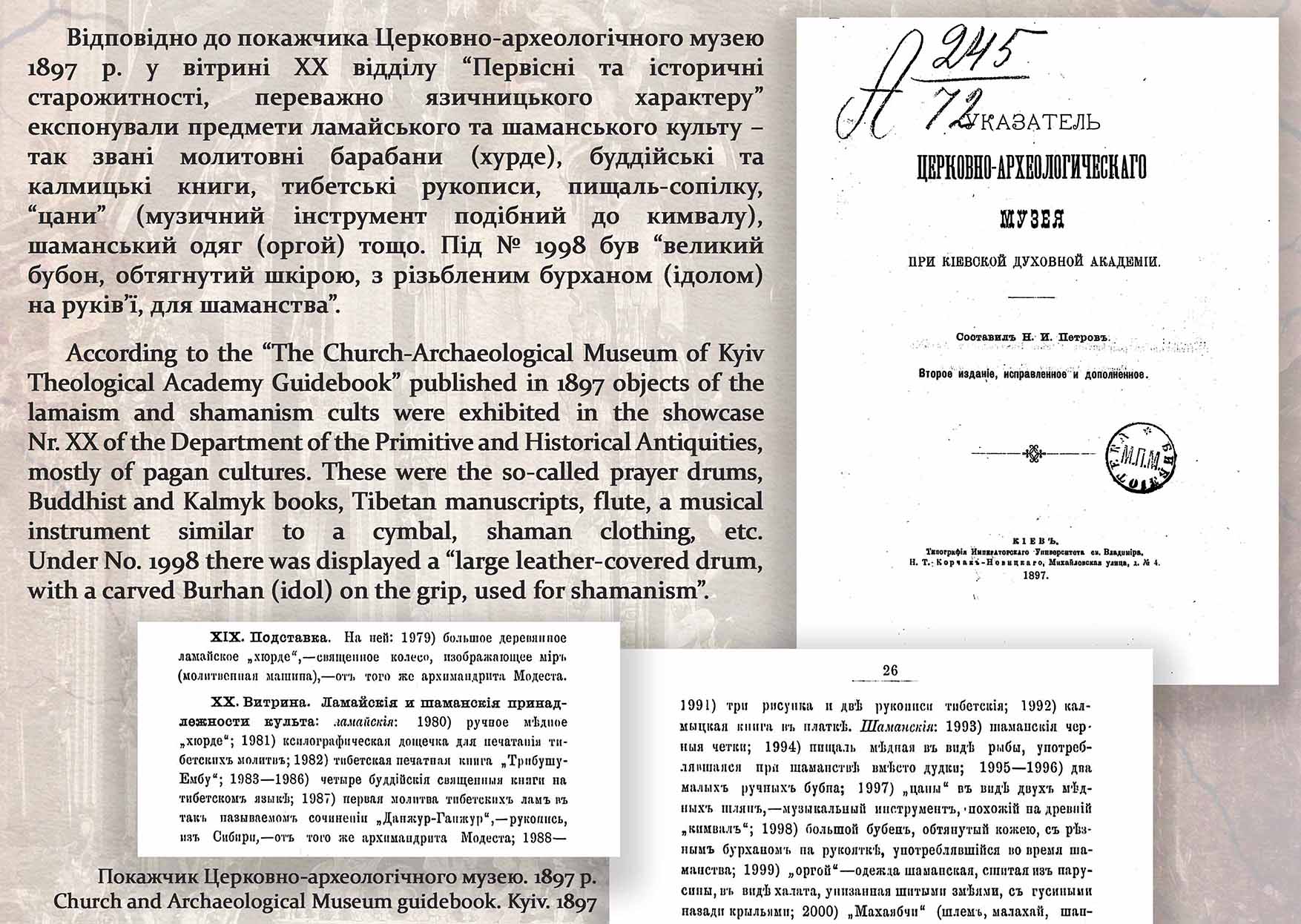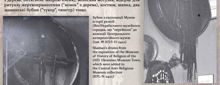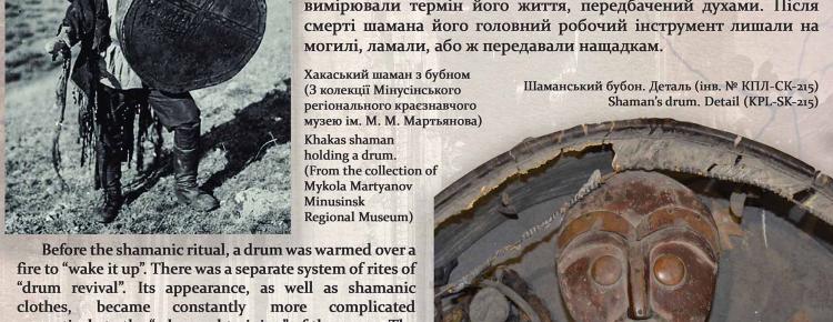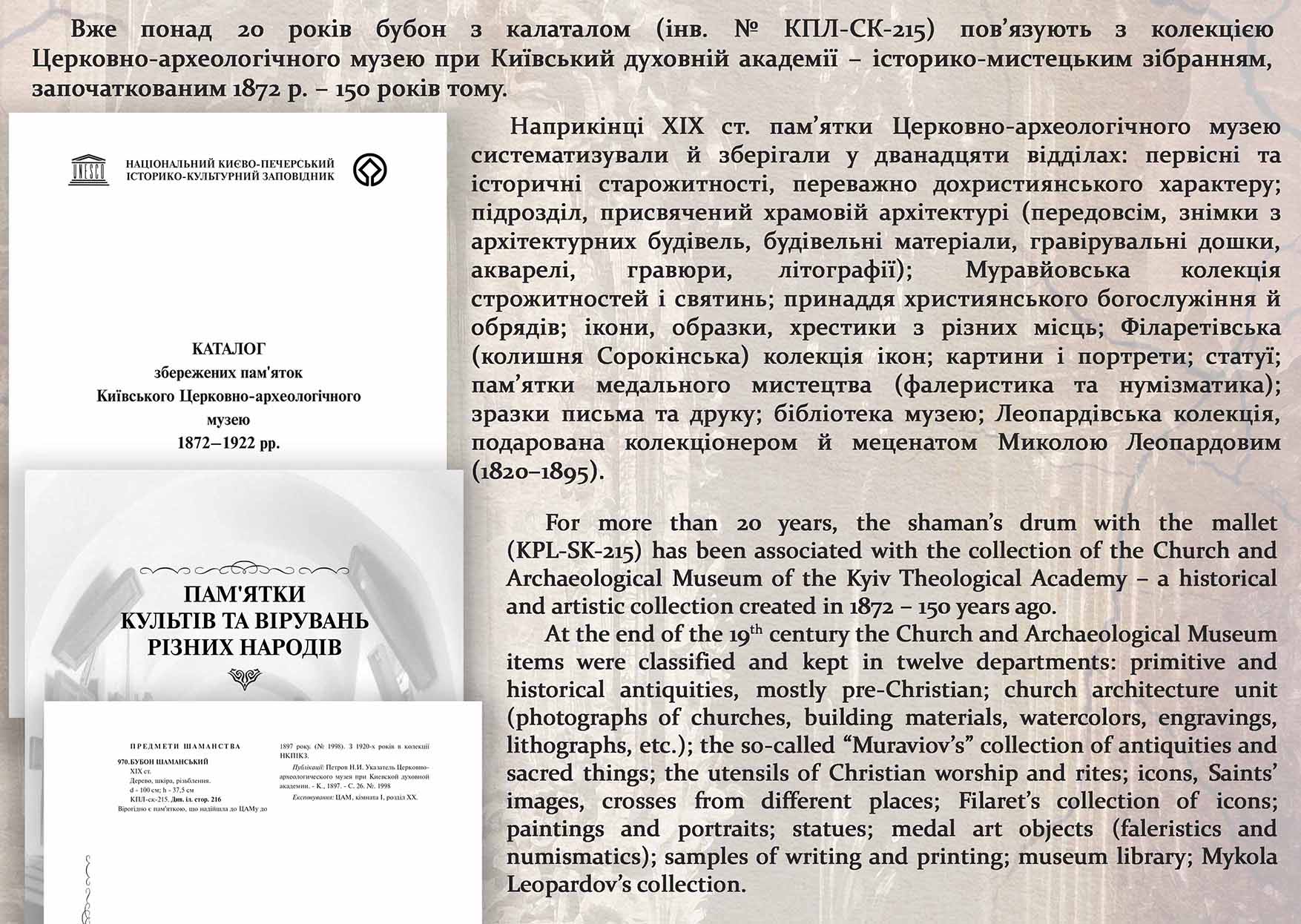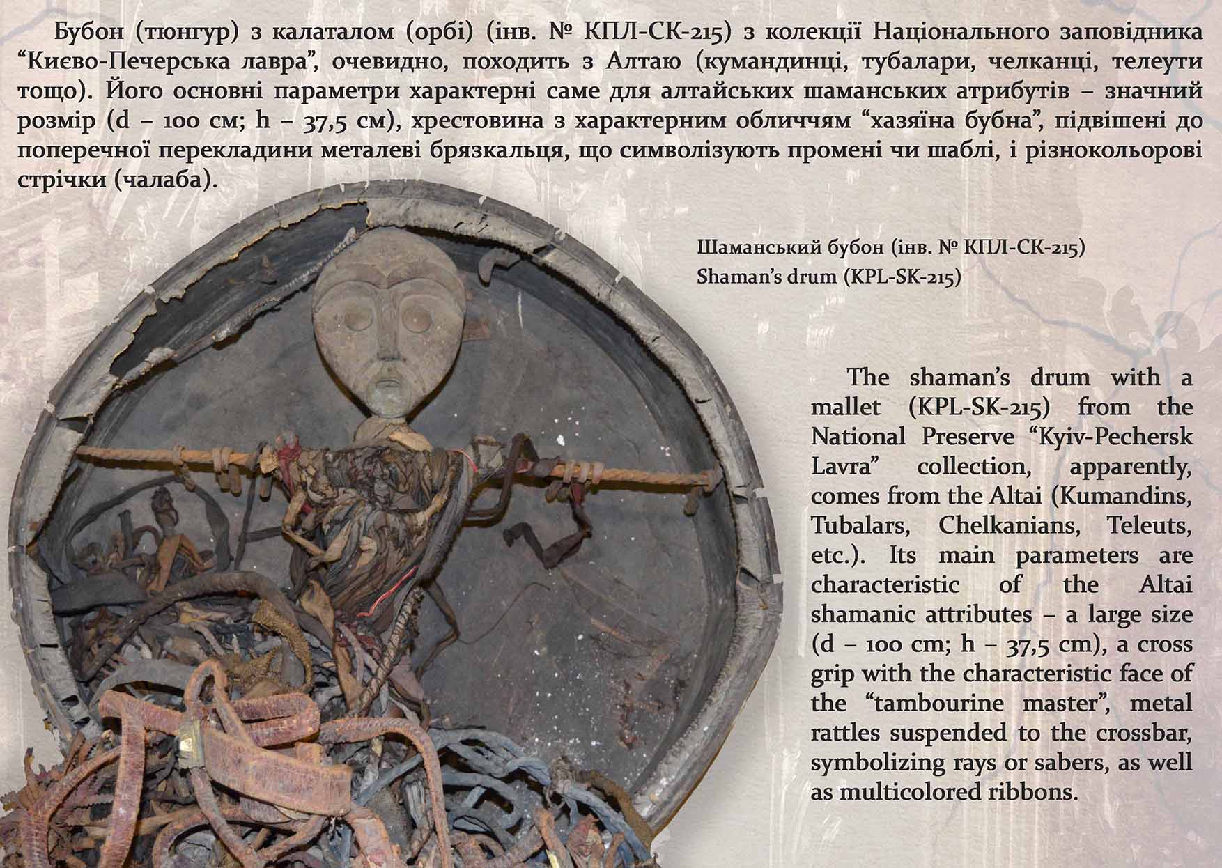Ми продовжуємо випуск нашої постійної рубрики “Експонат місяця”. У світлі широкомасштабної війни, яку розгорнула проти України й українського народу російська федерація, доводиться по-новому оцінювати досить своєрідне історичне надбання, яке тим чи іншим шляхом потрапило до наших музеїв за імперських або радянських часів. Такі предмети, здебільшого, є взірцями певних ідеологічних маніпуляцій, якими досить активно користувалася імперська, а ще більше – тоталітарна більшовицька влада, і наслідком яких є й сьогоднішня російська агресія. Адже певні експонати використовувалися для демонстрації «примітивности» колонізованих народів, знецінення їхнього культурного надбання з метою подальшого нівелювання та створення штучної ідентичності «радянської людини». Представляємо вашій увазі досить оригінальний предмет, особливо як для українського музею – шаманський бубон (тюнгур) з калаталом, який надійшов до колекції Національного заповідника «Києво-Печерська лавра» в 1920-ті роки.