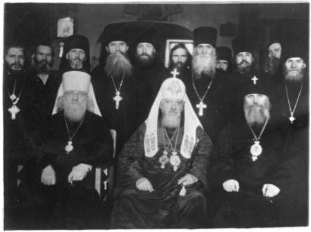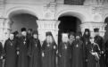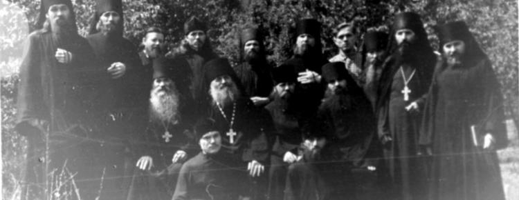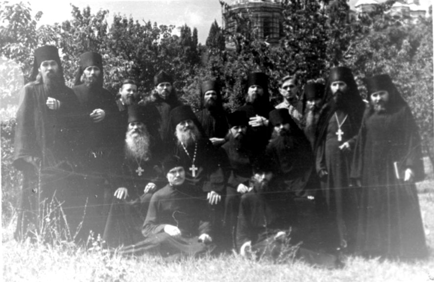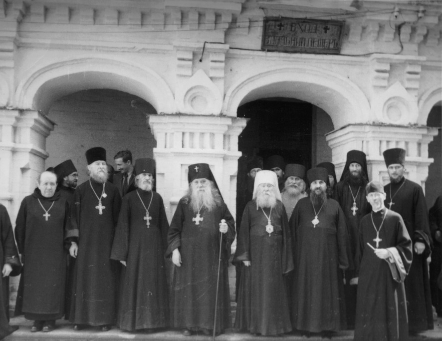 7. Патріарх Московський Олексій (Симанський) (в центрі), митрополит Київський і Галицький Іоанн (Соколов) й архієпископ Стефан (Проценко) серед лаврської братії. Перший праворуч – намісник, архімандрит Кронід. 1948 р.
